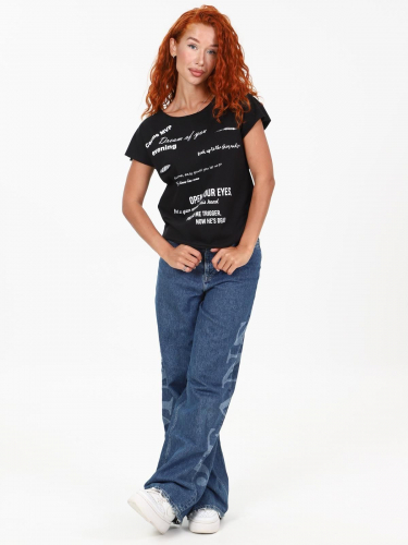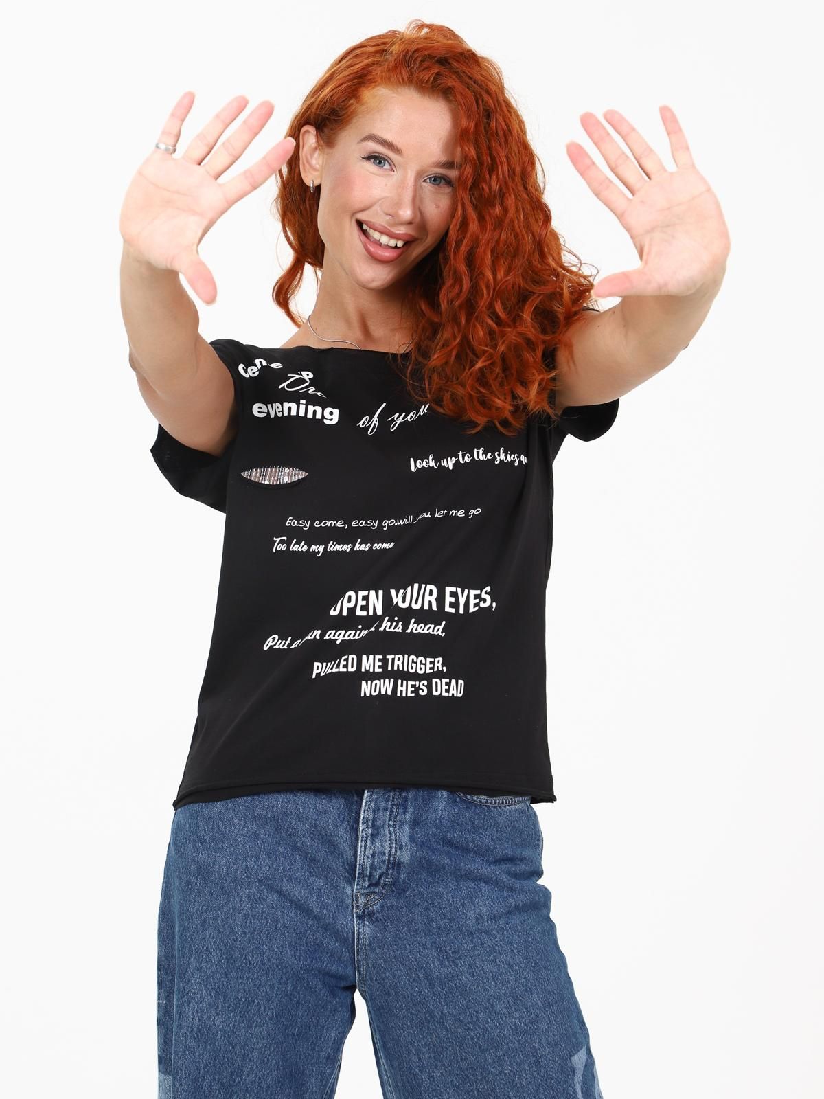 Женская футболка выполнена из трикотажного полотна "кулирка". Футболка свободная, без рукавов, со спущенным плечом, низ футболки, рукава и горловина с не заработанными краями, укрепленными обтачками, на передней части футболки принт с декоративными элементами-тесьма с пайетками, закрепленная в разрезах.