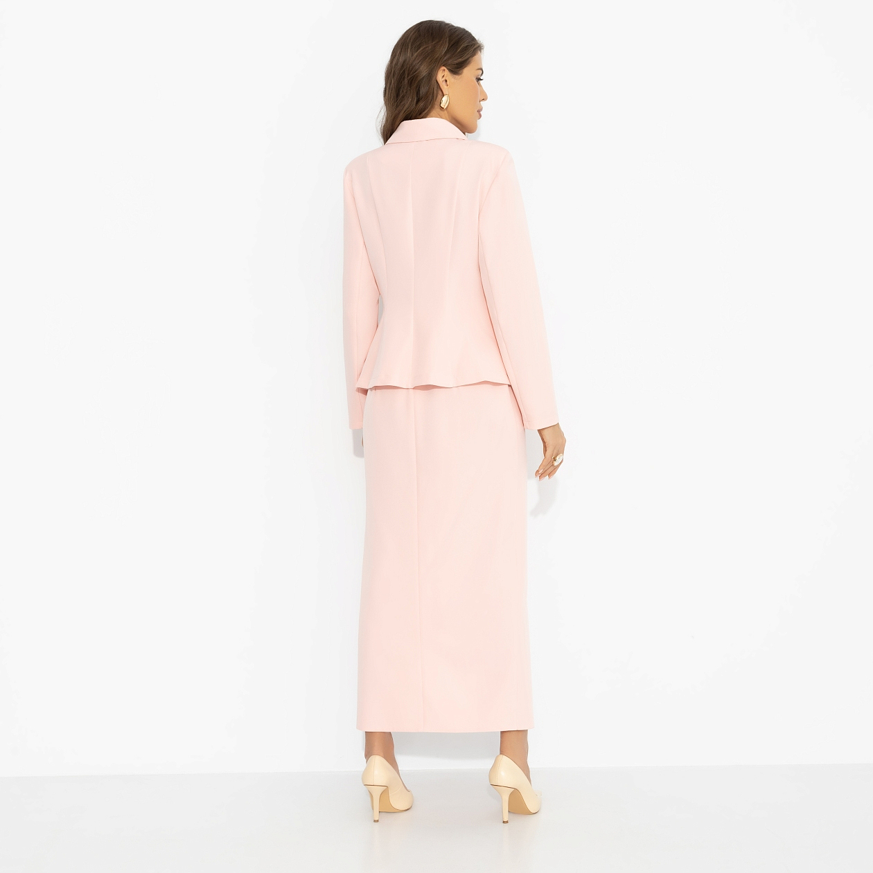 Сначала кажется – это про нежность. Потом становится ясно – про контроль. «Нежная власть» работает тонко: через посадку, линию плеч, через то, как вы держите себя в нём. Это не просто костюм. Это состояние, в котором вы не спешите – потому что решения уже приняты. Жакет прителенный на подплечниках.