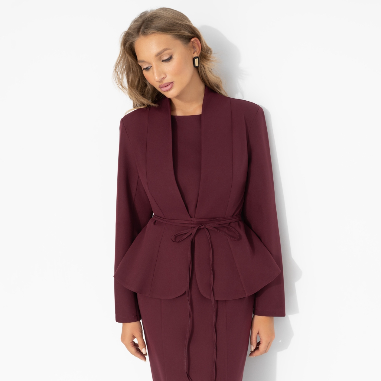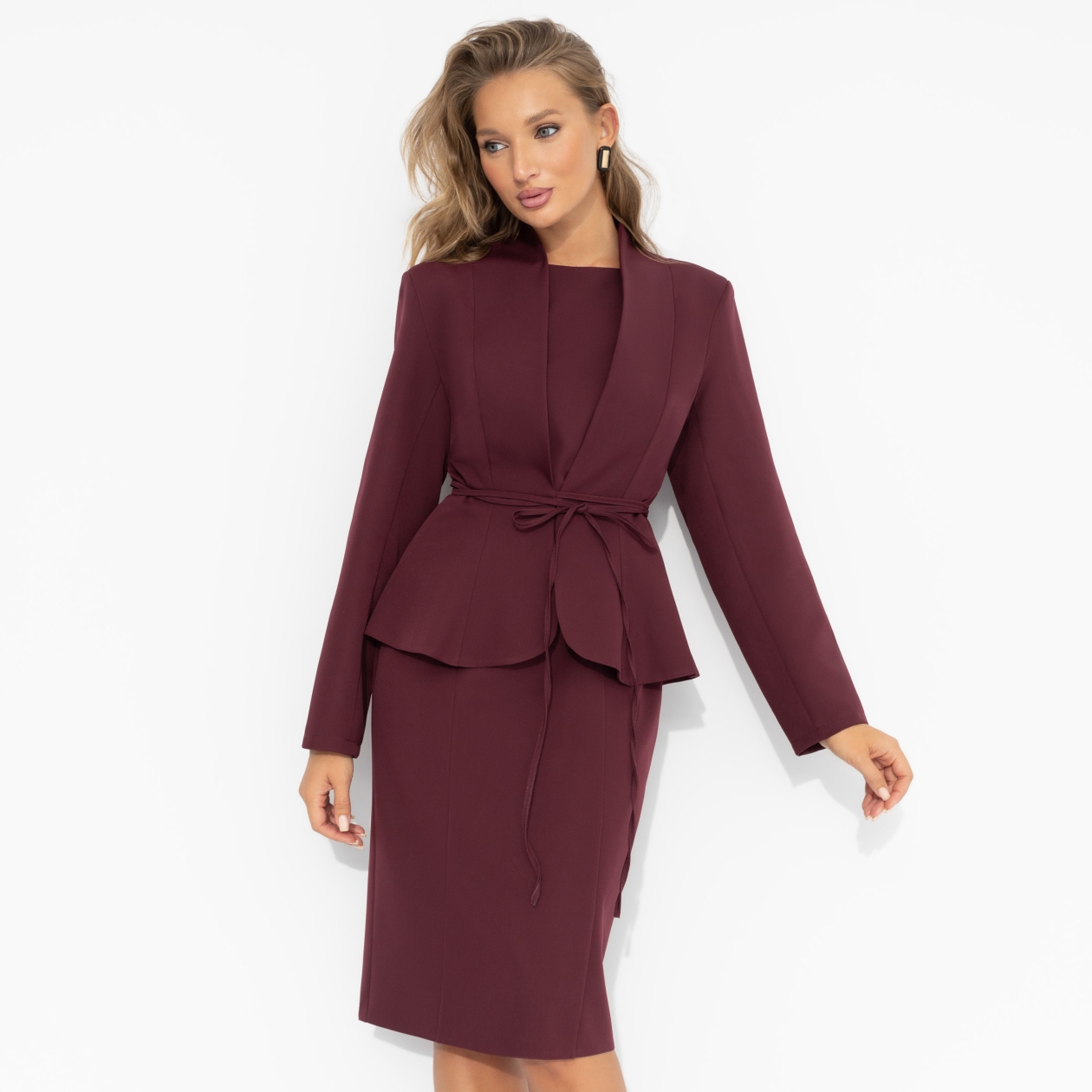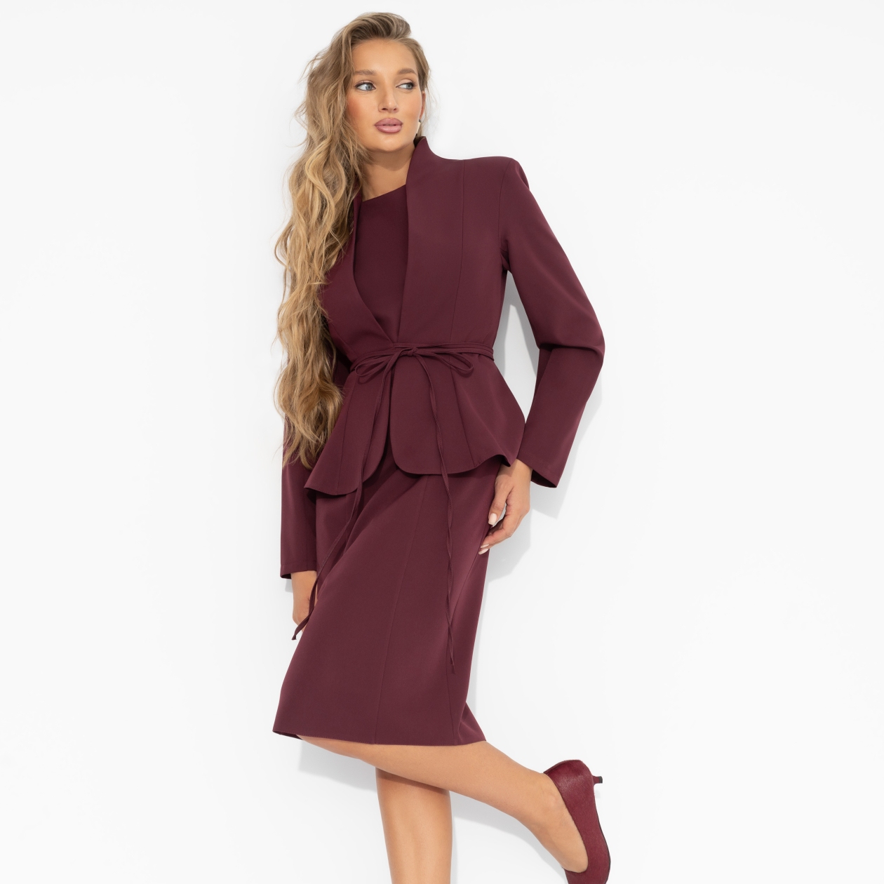Осень зовёт присмотреться к глубоким оттенкам – и влюбиться в винный оттенок мечты. Бархатистый костюм-двойка с платьем для тех, кто привык вдохновлять. Почувствуй – стиль может быть уютным. Стильный комплект: платье-футляр и жакет с поясом на завязках, подчёркивающим талию. Платье имеет классический крой, комфортную посадку. Жакет на подплечниках.