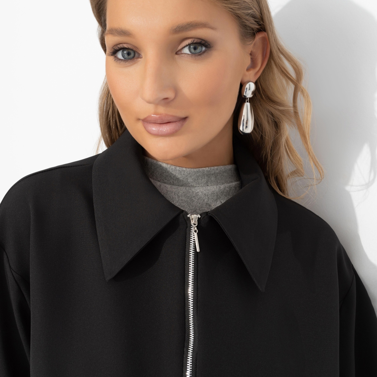 Формула городского кэжуала. Свободная черная куртка-бомбер на молнии и брюки-алладины создают струящийся силуэт с расслабленной посадкой. Такой комплект отлично подходит для активного дня в мегаполисе – почувствуйте уверенность, не жертвуя комфортом. Лаконичные линии и универсальный чёрный цвет создают тысячи комбинаций для стильных выходов, от встречи в кафе и прогулки на детской площадке до галереи современного искусства.