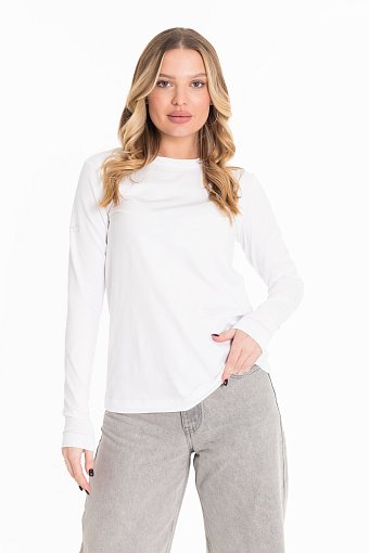 Лонслив женский выполнен из однотонной кулирки с лайкрой. Модель с длинными рукавами и круглым вырезом горловины, оформленным планкой.