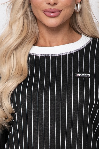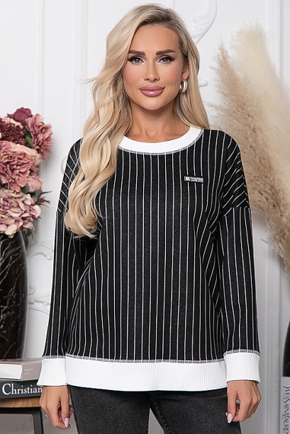 Джемпер из жаккардового трикотажного полотна в полоску свободного силуэта, дополнен  отделкой  вискозной,трикотажной белой рибаной.