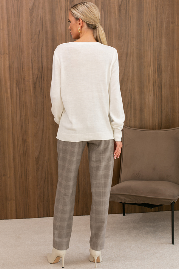 Джемпер полуприлегающего силуэта с длинным втачным рукавом. Низ изделия, низ рукава и V-образный вырез горловины оформлены резинкой. Изделие выполнено из мягкой структурированной пряжи.