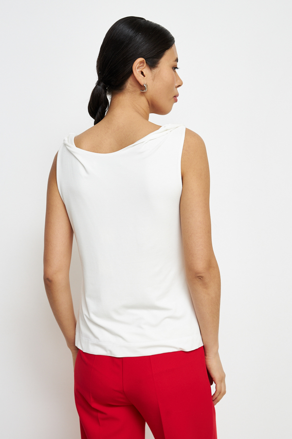 Джемпер полуприлегающего силуэта из вискозного эластичного полотна. Оригинальный крой с перекрутом на плечах. Изделие двухслойное с круглым вырезом горловины.
