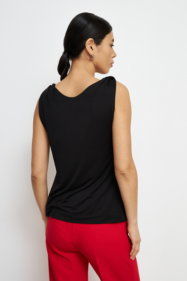 Джемпер полуприлегающего силуэта из вискозного эластичного полотна. Оригинальный крой с перекрутом на плечах. Изделие двухслойное с круглым вырезом горловины.