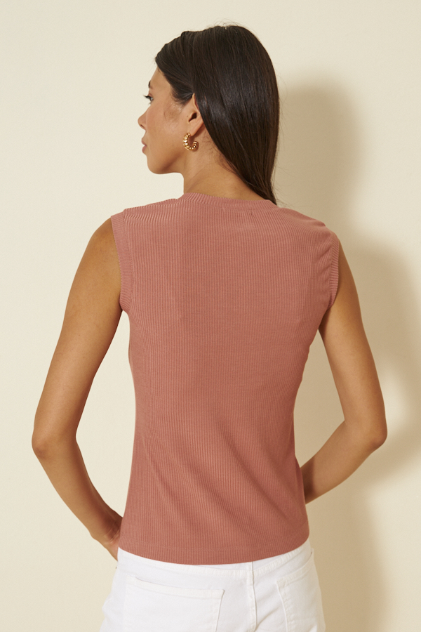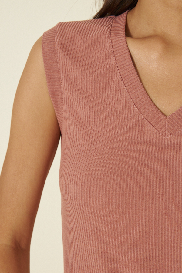 Джемпер прилегающего силуэта из эластичного полотна в рубчик. V-образный вырез горловины и линия проймы оформлены бейками.