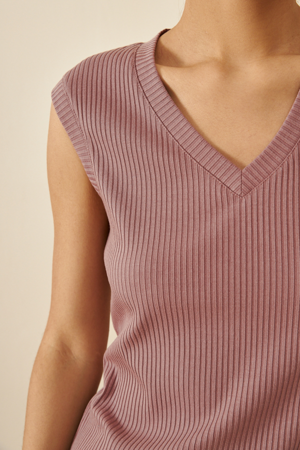 Джемпер прилегающего силуэта из эластичного полотна в рубчик. V-образный вырез горловины и линия проймы оформлены бейками.