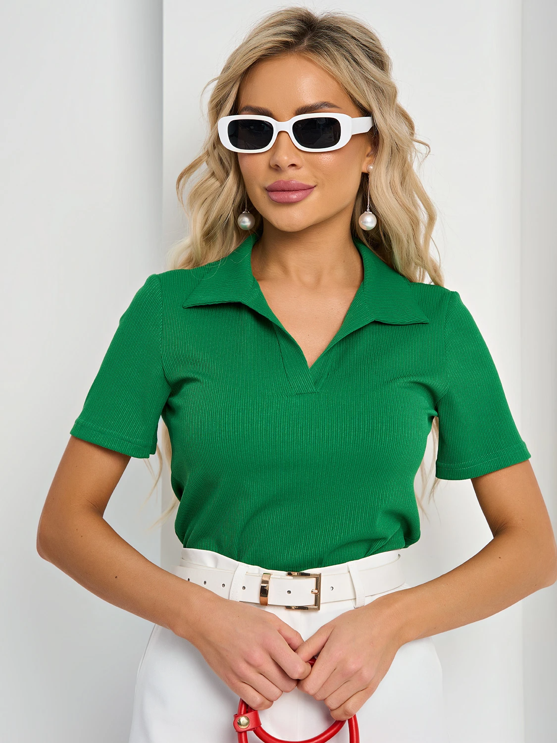 V-образный вырез горловины дополнен отложным воротничком рубашечного типа.
