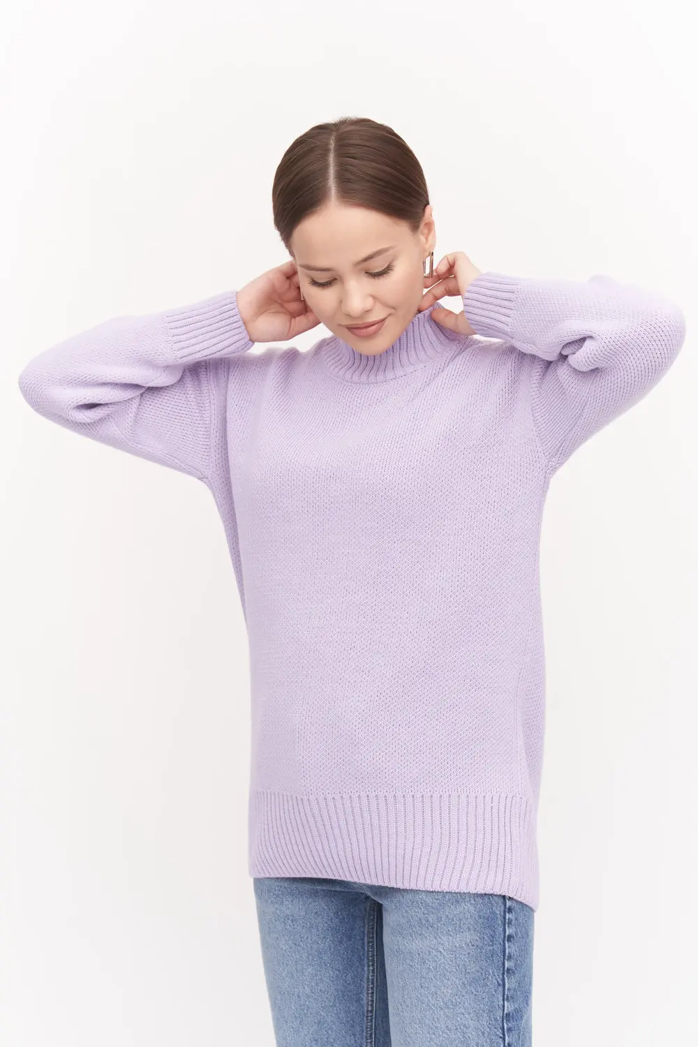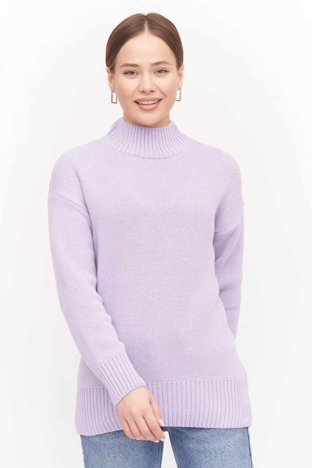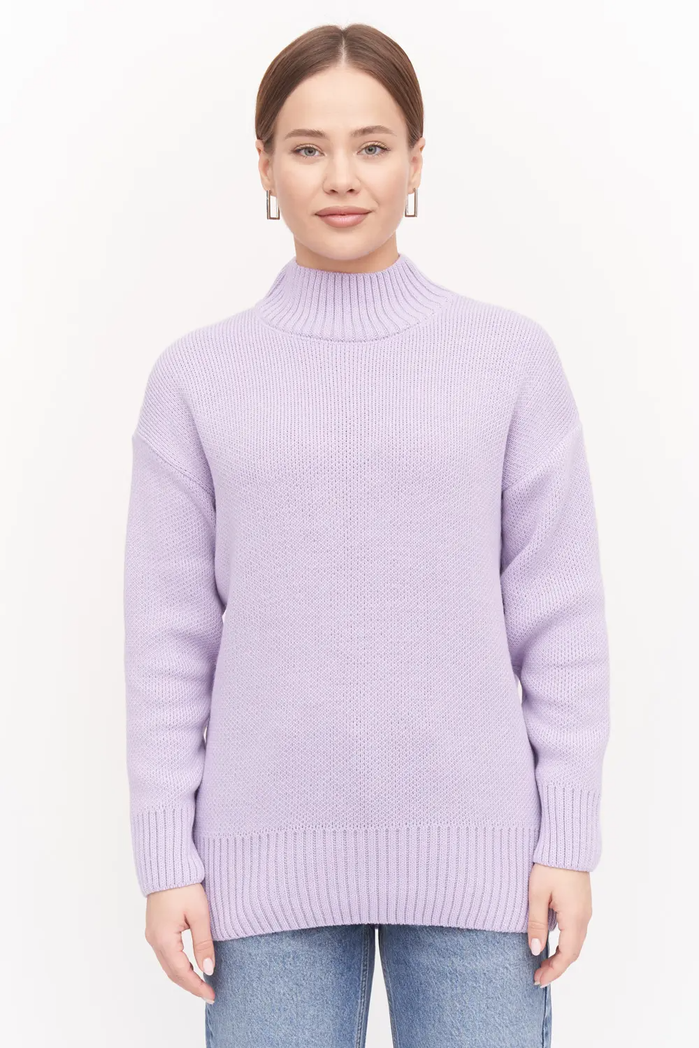 Женский джемпер свободного прямого кроя с воротником - стойкой. Спущенная линия плеча и длинный рукав.  По низу изделия и рукавов мягкие резинки.Незаменимая модель для создания модных и комфортных образов в прхладную погоду. лиловый
