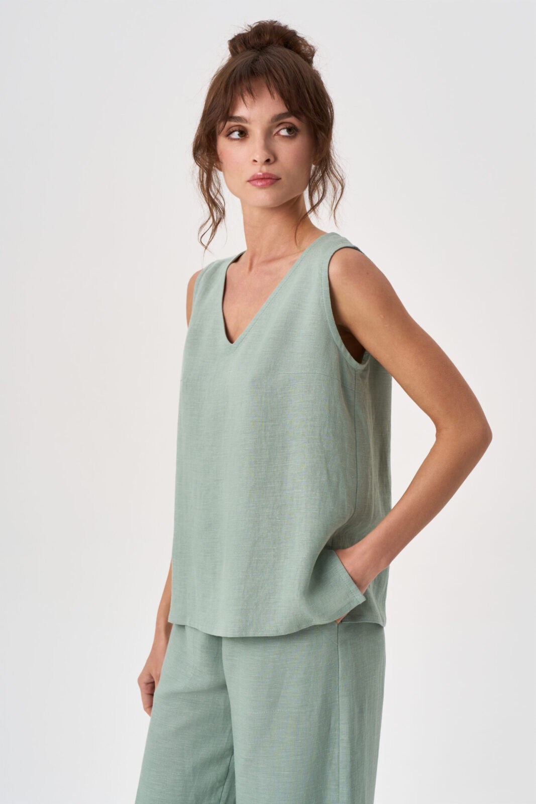 Майка женская прямая длиной до середины бедра с разрезами по бокам. Вырез горловины V-образной формы.