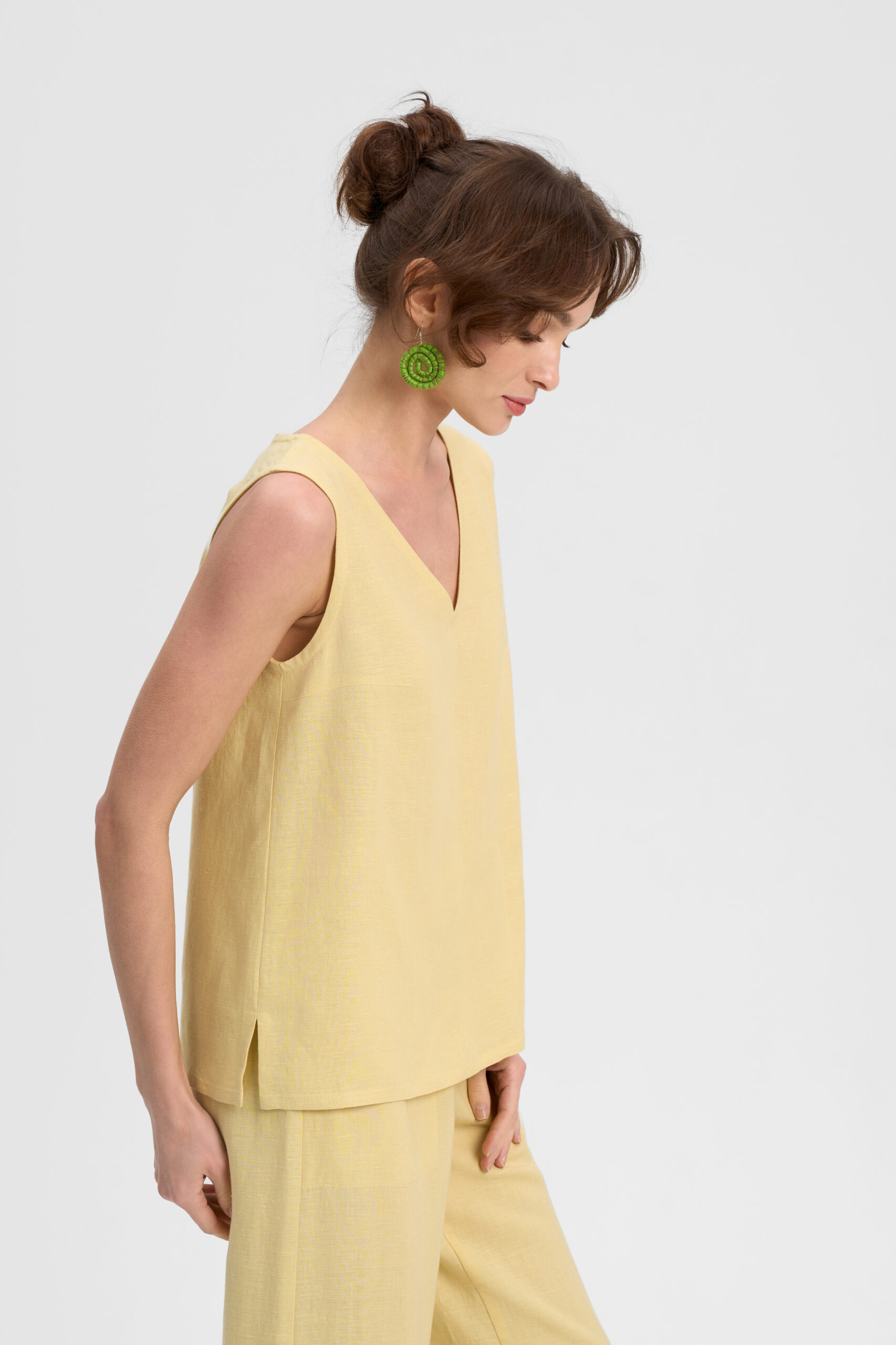 Майка женская прямая длиной до середины бедра с разрезами по бокам. Вырез горловины V-образной формы.
