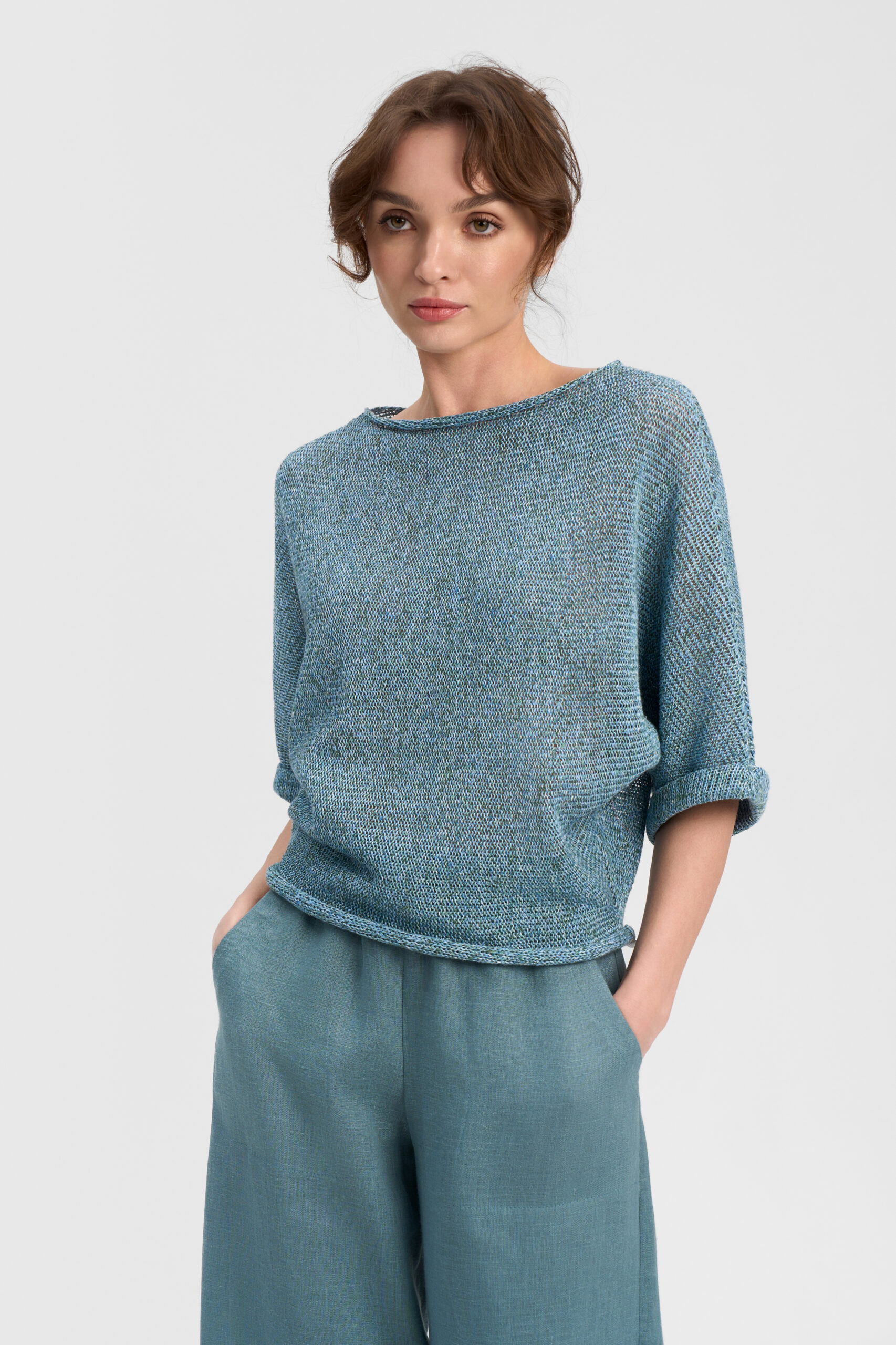 Джемпер женский цельновязаный среднего объема без боковых и плечевых швов. Вырез горловины в форме «лодочка». Низ рукава с отворотом.