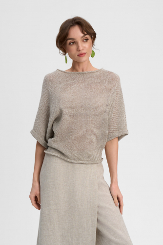 Джемпер женский цельновязаный среднего объема без боковых и плечевых швов. Вырез горловины в форме «лодочка». Низ рукава с отворотом.