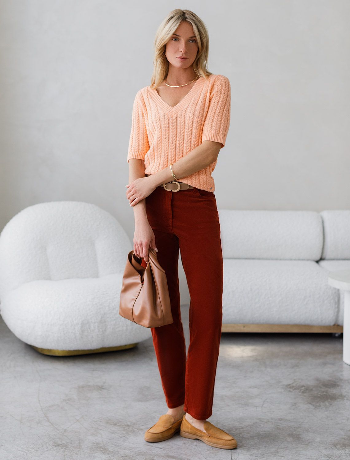 Джемпер фактурной вязки выполнен из хлопка с добавлением кашемира. Модель с V-вырезом с вывязанным орнаментом цепи. Мягкая и очень приятная пряжа совершенно не колется, сохраняет тепло при этом не перегревая, гарантируя безупречный комфорт. 70%Хлопок 21%ПА 9%Кашемир