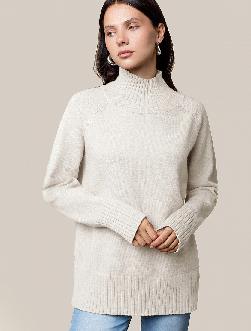 Джемпер с воротом стойка выполнен из мягкой меланжевой пряжи с кашемиром. Модель свободного силуэта с рукавом реглан будет стильно сочетается с брюками и джинсами. Мягкая пряжа очень приятная к телу, поддержит комфорт на протяжении всего дня, при этом не перегревая. Сочетается в костюме с брюками D38.013, D38.012 и юбкой D36.016 52%ПАН (акрил) 33%ПЭ 8%ПУ 7%Кашемир