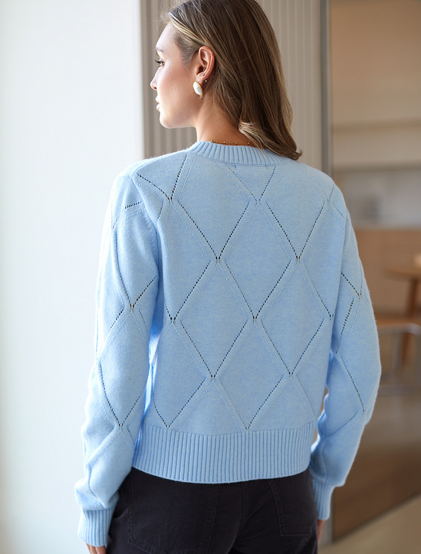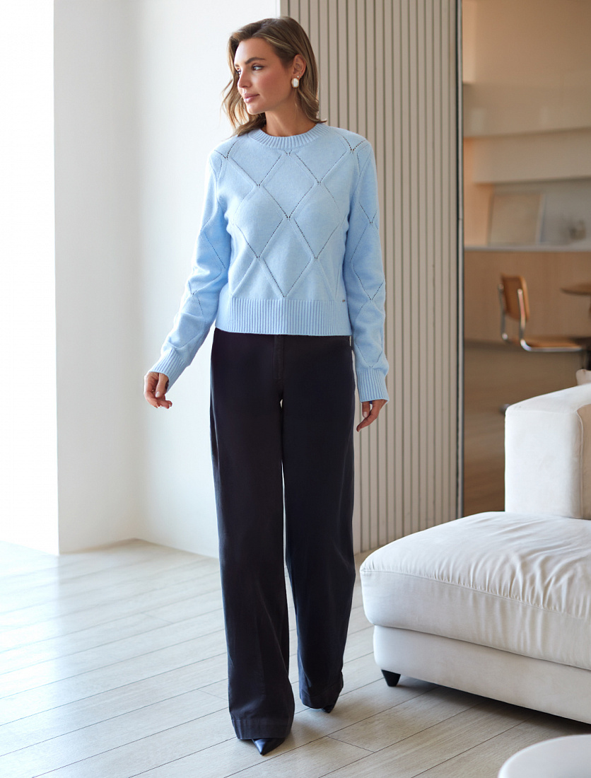 Невероятно женственный джемпер светло-голубого цвета с круглым вырезом связан из высококачественной пряжи с кашемиром — идеальное сочетание мягкости и практичности. Пряжа с кашемиром придаёт ему бархатистую нежность и тонкую структуру, каждое прикосновение с которой, напоминает о тепле и уюте в прохладные дни. Благодаря нежной текстуре материала этот вариант отлично подходит даже для чувствительной кожи, не вызывая раздражения и дискомфорта в течение дня. Сдержанный, элегантный силуэт джемпера подчёркивает вкуc обладательницы, а филигранная отделка ворота — внимание к деталям. Фактурный графичный узор украшает джемпер, добавляя легкую нотку нарядности без лишней вычурности. Универсальный оттенок и изящная мягкость делают его идеальным выбором в любой ситуации. Широкие манжеты и нижний край добавляют аккуратности, а продуманная посадка делает повседневный джемпер удобным для многослойных образов — от офисного комплекта, например, в сочетании с блузкой, до расслабленного уикенда. Свободный крой джемпера идеально подходит для женщин, которые ценят удобство и стиль одновременно, а так же идеально подходит на большие размеры. Благодаря качественной пряже свитер сохраняет форму и внешний вид даже после многократных носок. Практичный фасон идеально подходит для работы в офисе или встреч с друзьями. Благодаря классическому крою джемпер гармонично сочетается практически с любыми элементами гардероба, помогая всегда выглядеть актуально. Сочетается в костюме с брюками D38.013, D38.012 и юбкой D36.016 52%ПАН (акрил) 33%ПЭ 8%ПУ 7%Кашемир