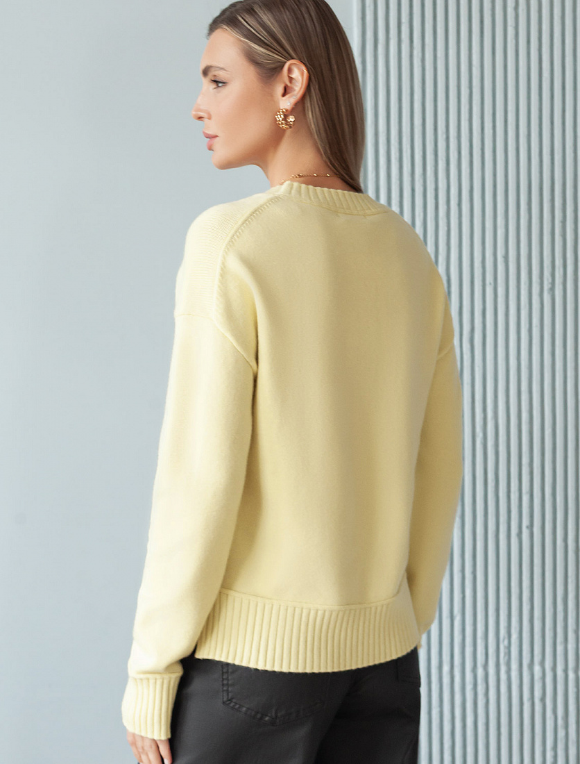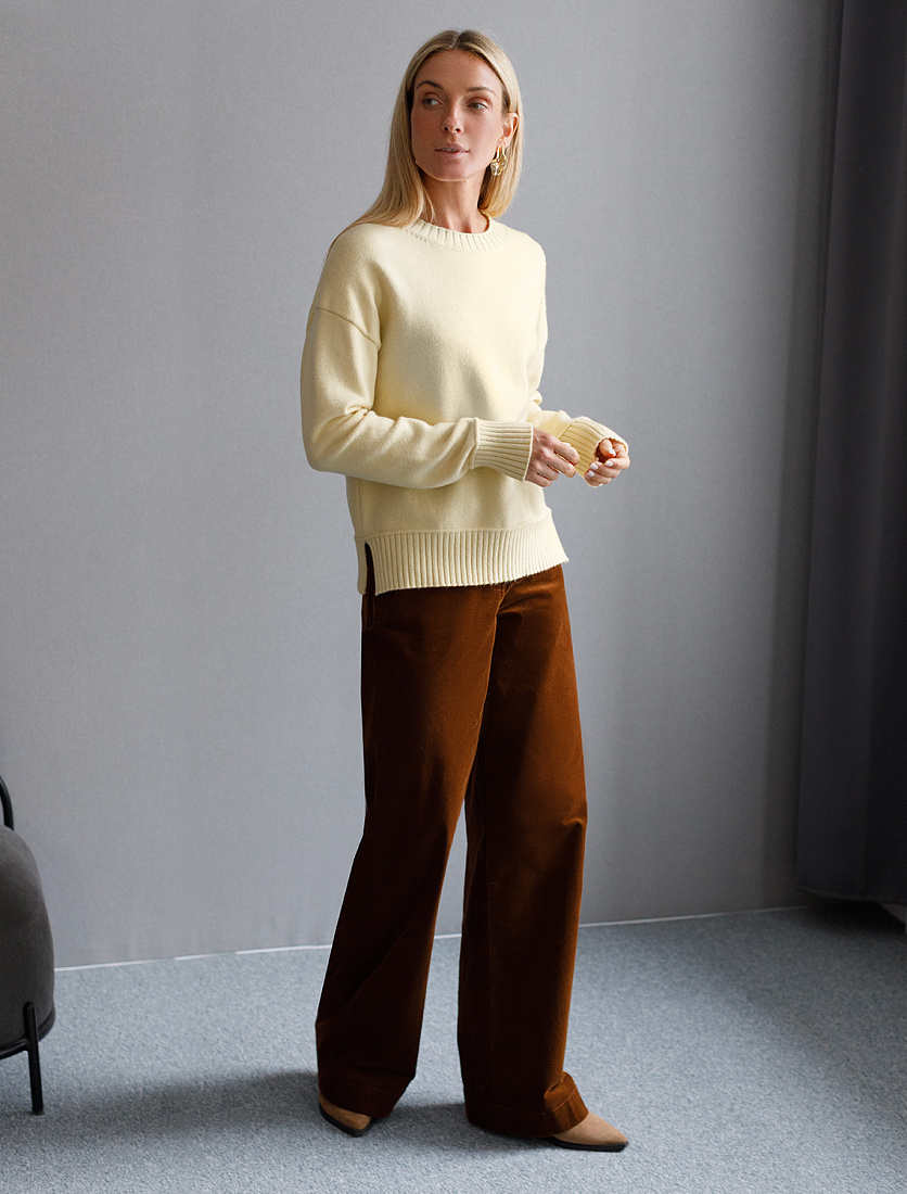 Укороченный джемпер светло-желтого цвета с круглым вырезом связан из высококачественной пряжи с кашемиром — идеальное сочетание мягкости и практичности. Пряжа с кашемиром придаёт ему бархатистую нежность и тонкую структуру, каждое прикосновение с которой, напоминает о тепле и уюте в прохладные дни. Благодаря нежной текстуре материала этот вариант отлично подходит даже для чувствительной кожи, не вызывая раздражения и дискомфорта в течение дня. Сдержанный, элегантный силуэт джемпера подчёркивает вкуc обладательницы, а филигранная отделка ворота — внимание к деталям. Универсальный оттенок и изящная мягкость делают его идеальным выбором в любой ситуации Широкие манжеты и нижний край добавляют аккуратности, а продуманная посадка и небольшие разрезы по бокам делают повседневный джемпер удобным для многослойных образов — от офисного комплекта до расслабленного уикенда. Свободный крой джемпера идеально подходит для женщин, которые ценят удобство и стиль одновременно, а так же идеальноподходит на большие размеры. Благодаря качественной пряже свитер сохраняет форму и внешний вид даже после многократных носок.
