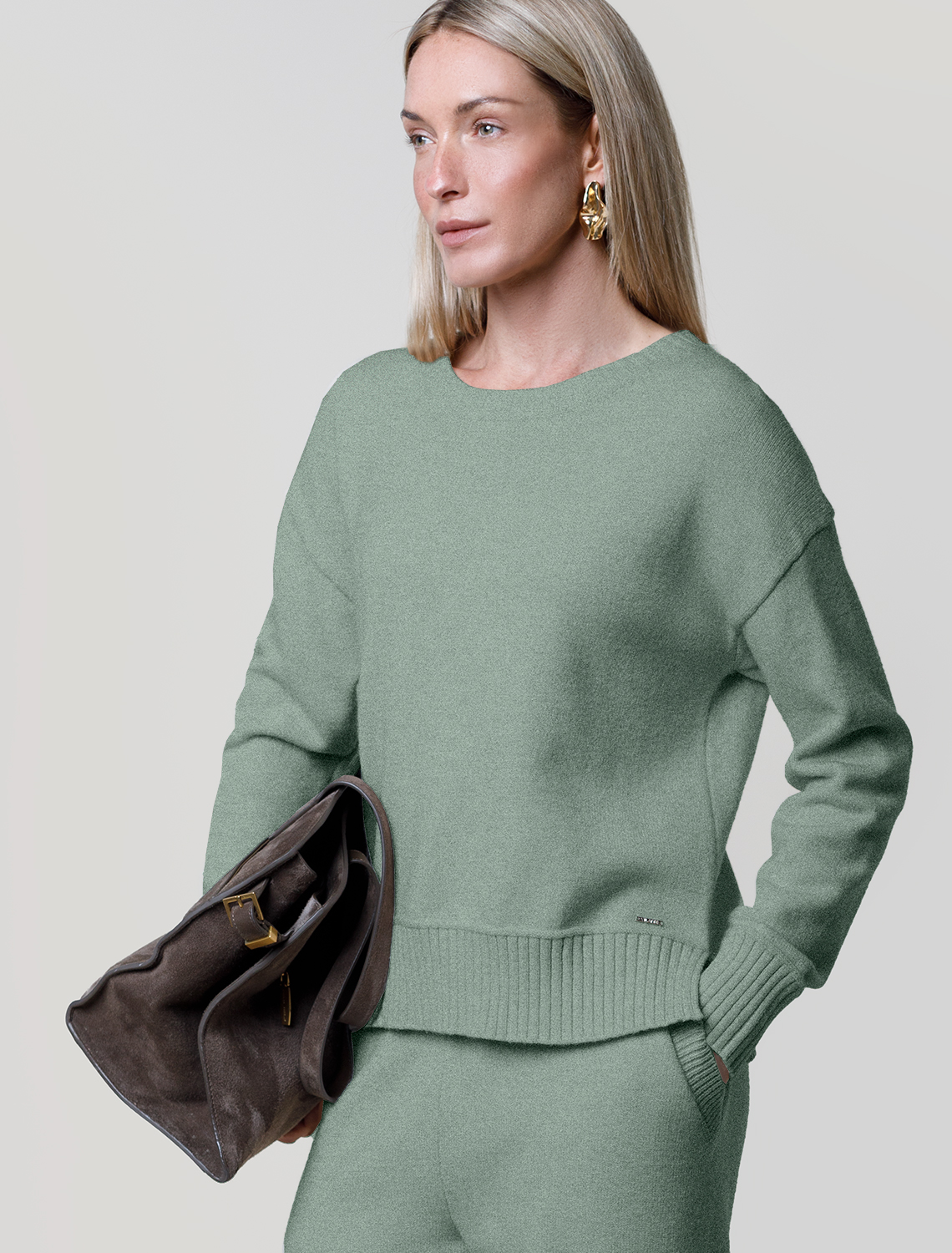 Укороченный джемпер светло-оливкового цвета с круглым вырезом связан из высококачественной пряжи с кашемиром — идеальное сочетание мягкости и практичности. Пряжа с кашемиром придаёт ему бархатистую нежность и тонкую структуру, каждое прикосновение с которой, напоминает о тепле и уюте в прохладные дни. Благодаря нежной текстуре материала этот вариант отлично подходит даже для чувствительной кожи, не вызывая раздражения и дискомфорта в течение дня. Сдержанный, элегантный силуэт джемпера подчёркивает вкуc обладательницы, а филигранная отделка ворота — внимание к деталям. Универсальный оттенок и изящная мягкость делают его идеальным выбором в любой ситуации Широкие манжеты и нижний край добавляют аккуратности, а продуманная посадка и небольшие разрезы по бокам делают повседневный джемпер удобным для многослойных образов — от офисного комплекта до расслабленного уикенда. Свободный крой джемпера идеально подходит для женщин, которые ценят удобство и стиль одновременно, а так же идеальноподходит на большие размеры. Благодаря качественной пряже свитер сохраняет форму и внешний вид даже после многократных носок.