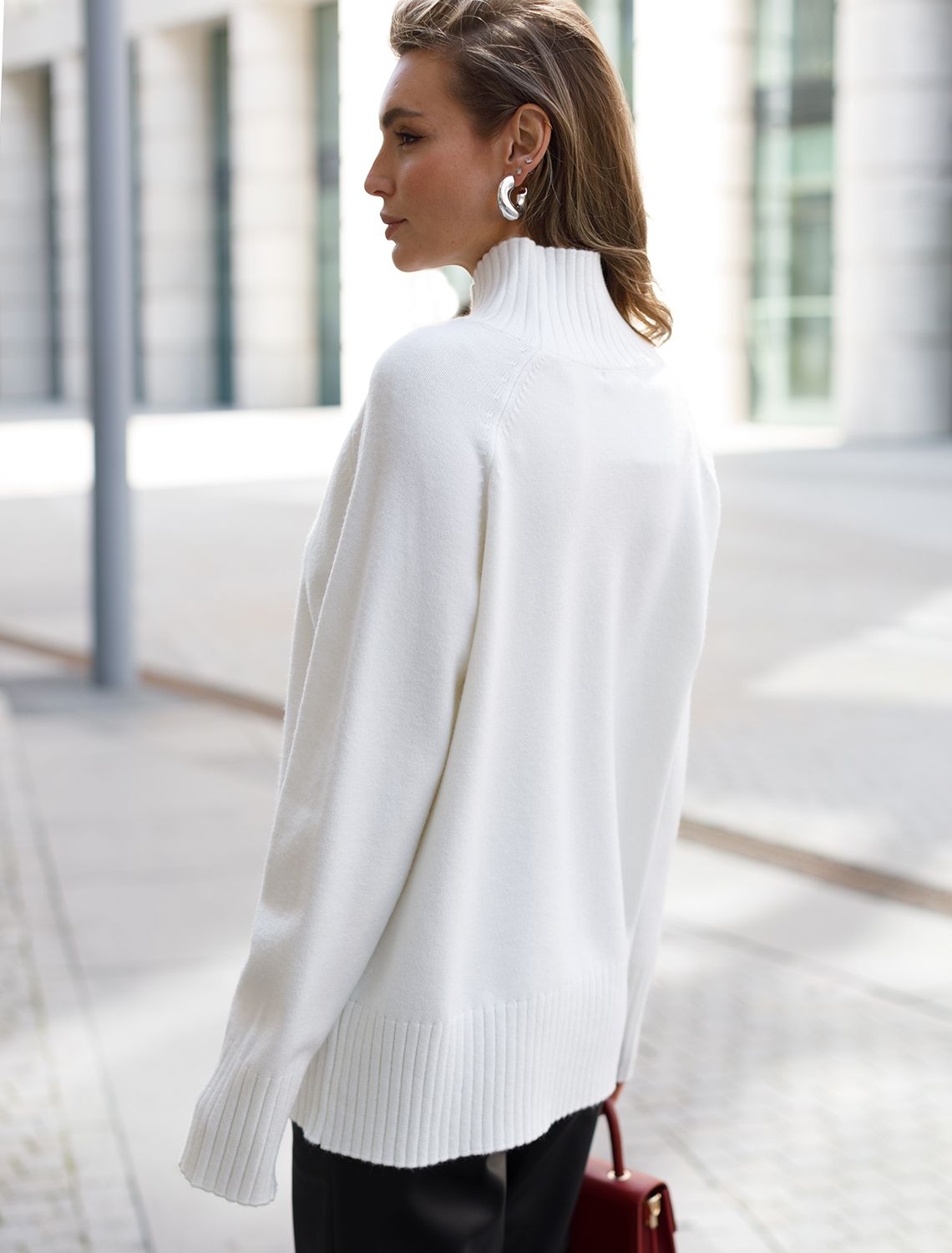 Джемпер с воротом стойка выполнен из мягкой пряжи с кашемиром. Модель свободного силуэта с рукавом реглан будет стильно сочетается с брюками и джинсами. Мягкая пряжа очень приятная к телу, поддержит комфорт на протяжении всего дня, при этом не перегревая. Сочетается в костюме с брюками D38.013, D38.012 и юбкой D36.016