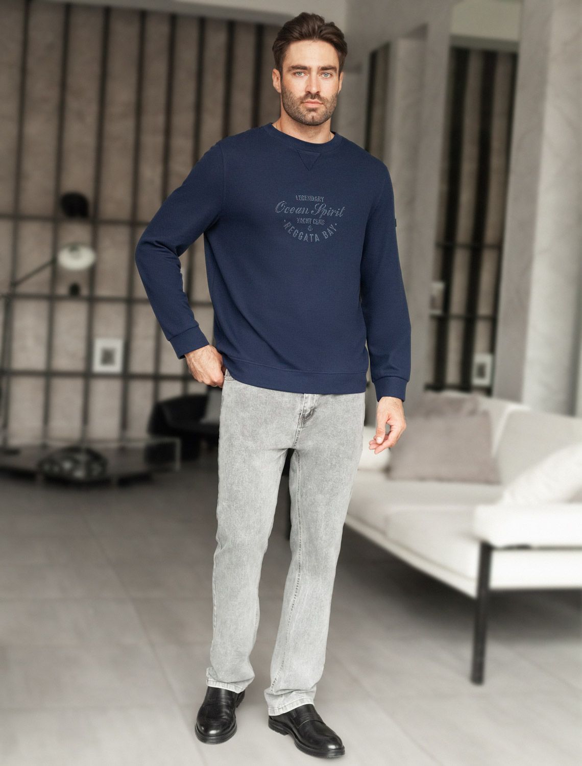 Легкий и невероятно комфортный джемпер светло-синего цвета создан для повседневного образа. Мягкий фактурный эластичный трикотаж приятно ощущается на теле, не сковывает движения и отлично подходит для носки в любое время года. Полуприлегающий крой обеспечивает свободу и удобство, позволяя выглядеть стильно и чувствовать себя уверенно каждый день. Круглый ворот украшен декоративной нашивкой в виде перевернутого треугольника, добавляющей оригинальности.. Манжеты на рукавах и по низу аккуратно оформлены, что придает завершенность внешнему виду и способствует сохранению формы джемпера после длительной носки и многочисленных стирок. Принт в виде небольшой надписи добавляет яркости, подчеркивая индивидуальность каждого мужчины. Перевод надписи: Legendary ocean spirit yacht club regatta bay - Легендарный яхт-клуб Ocean Spirit, регатная бухта.
