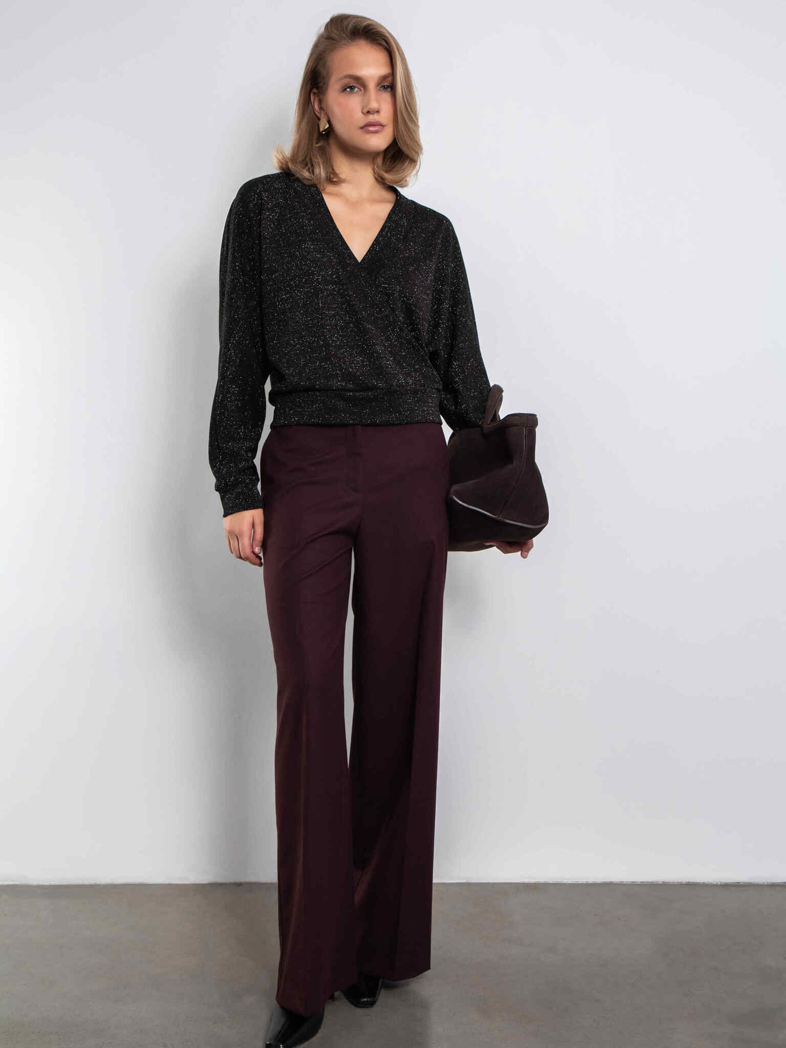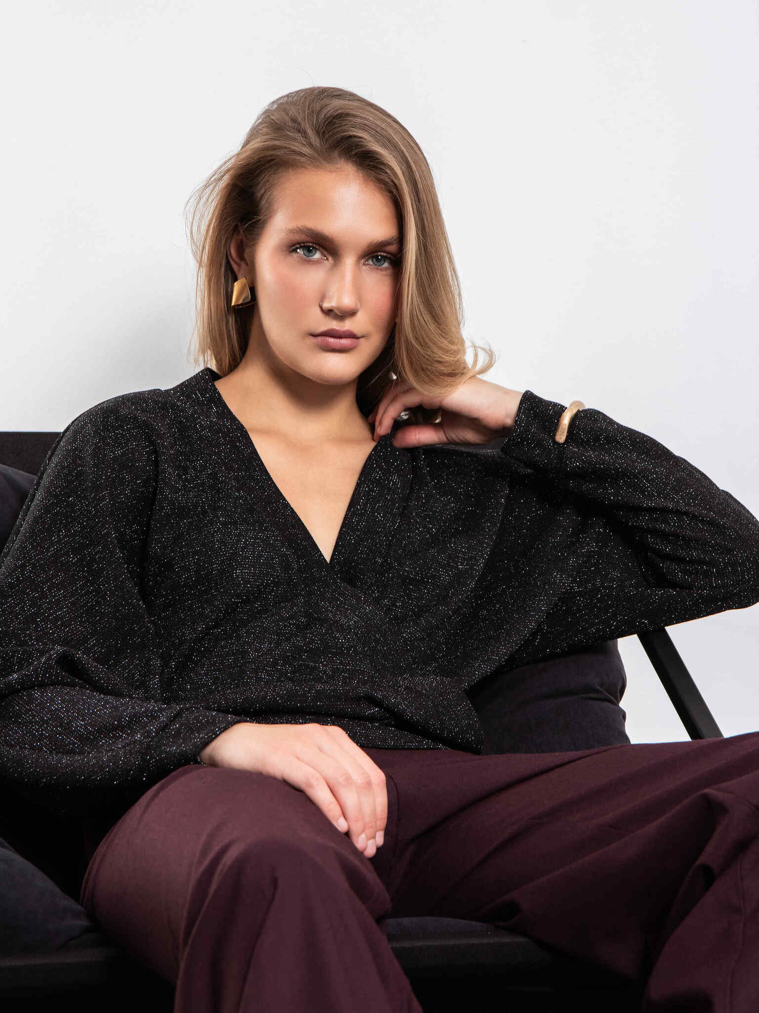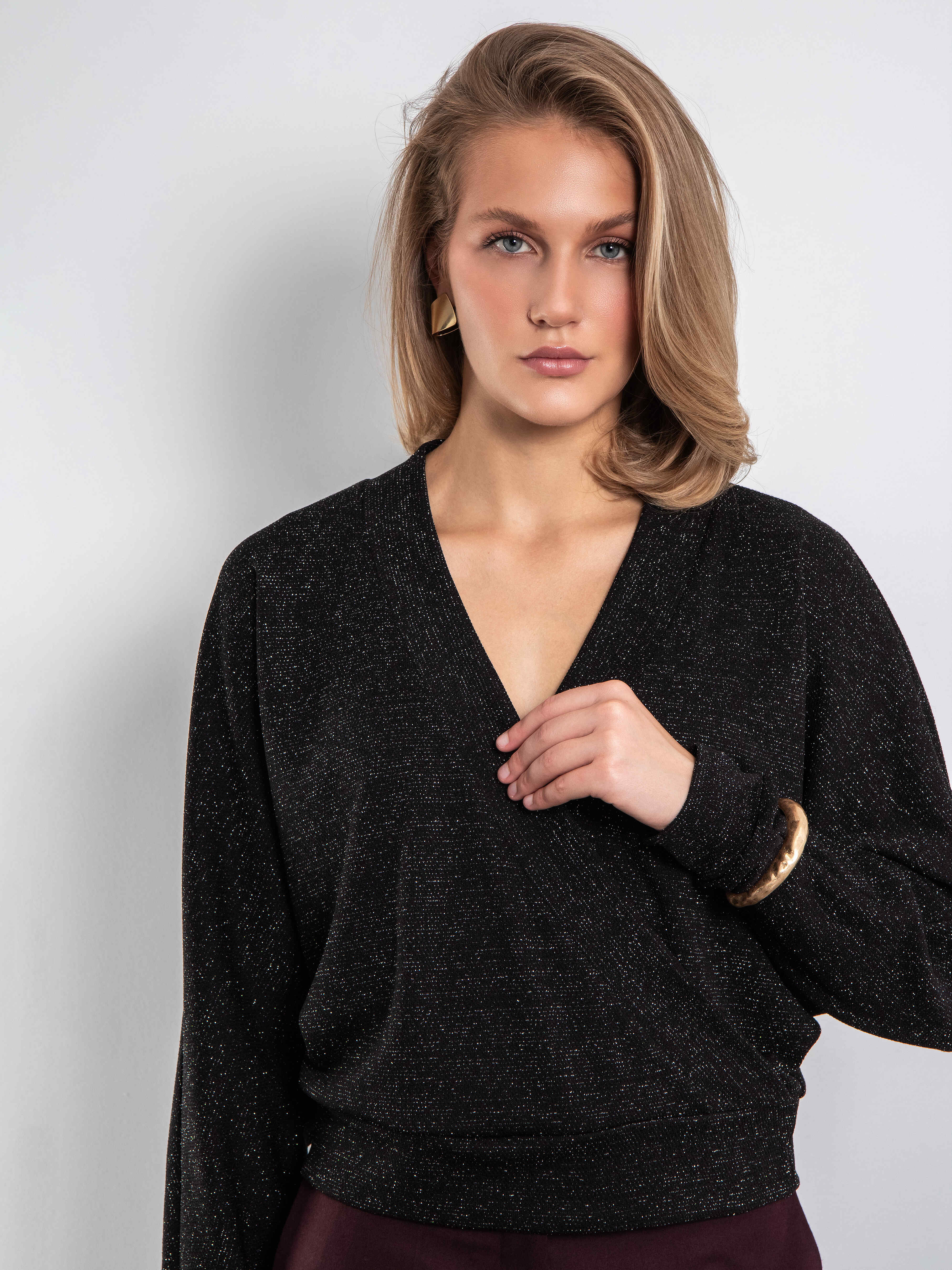 Джемпер из плотного трикотажа с люрексом с V-вырезом, рукавами "летучая мышь"заниженной линией плеча, широкими манжетами и нижним краем.