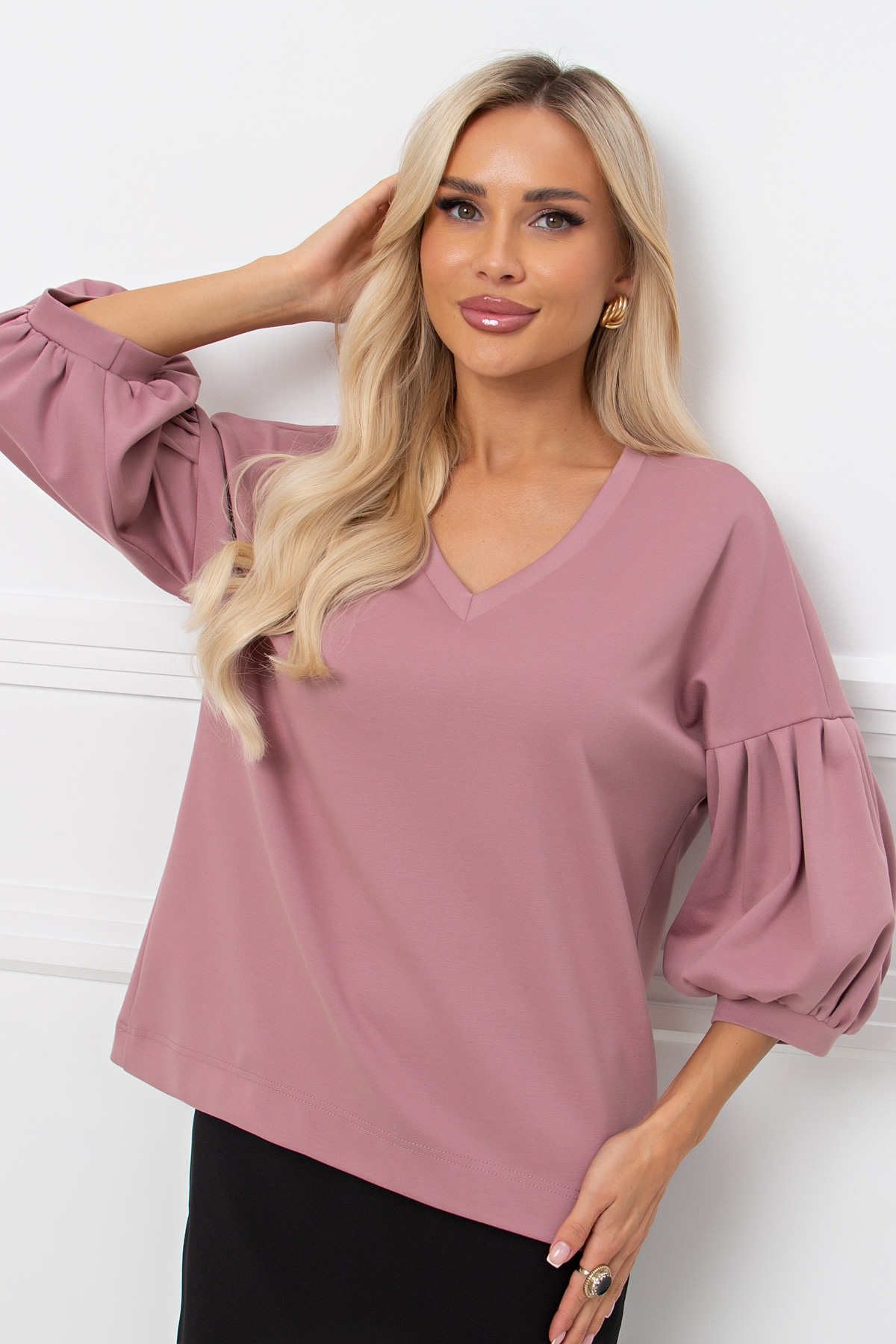 Женственный джемпер свободного кроя из трикотажного полотна. V - образная горловина оформлена внешней обтачкой. Втачной рукав длинной 3/4 со спущенным плечом, оканчивается притачной манжетой. Объем рукаву придают заложенные защипы. Низ ровный, без разрезов.