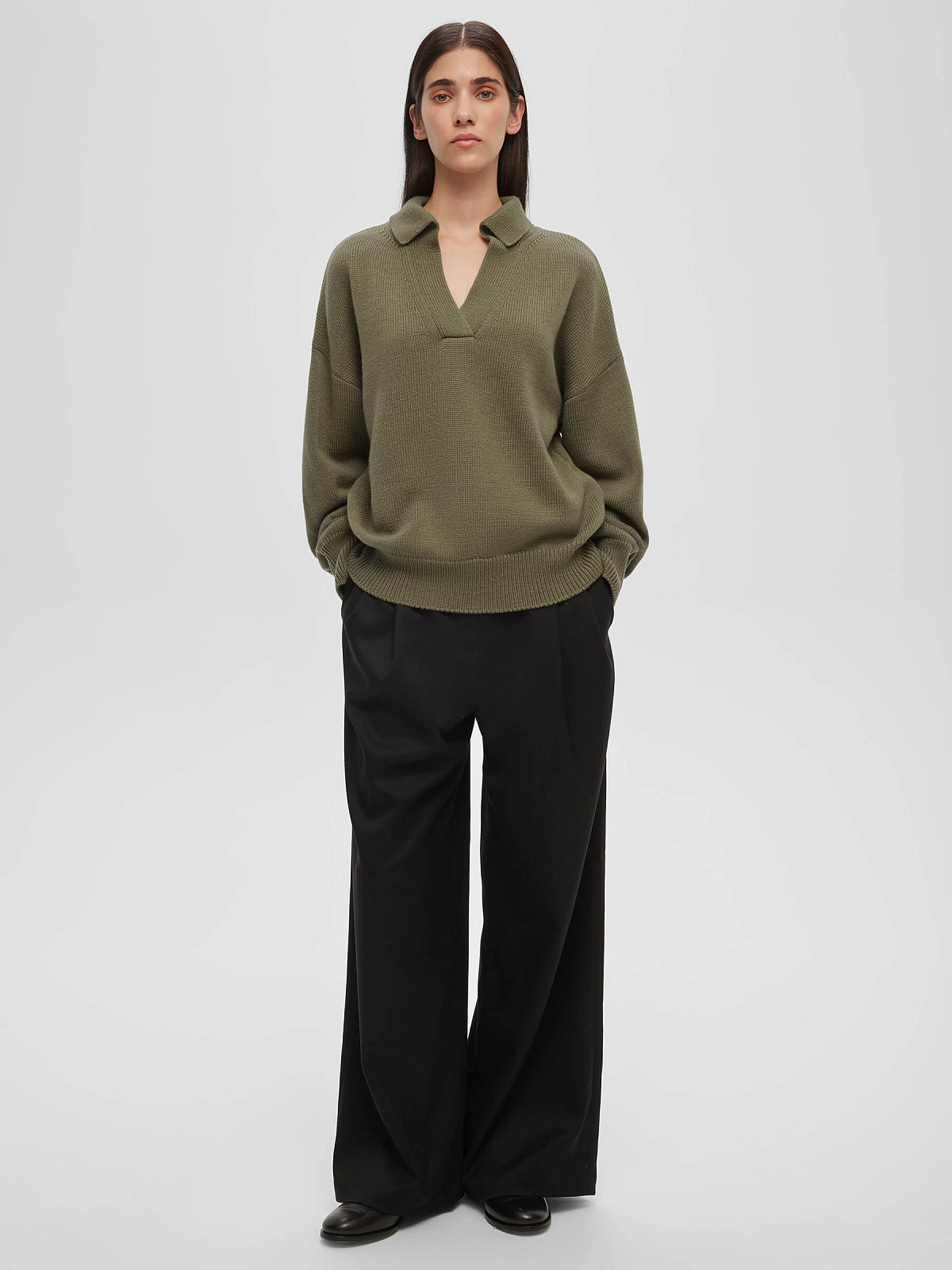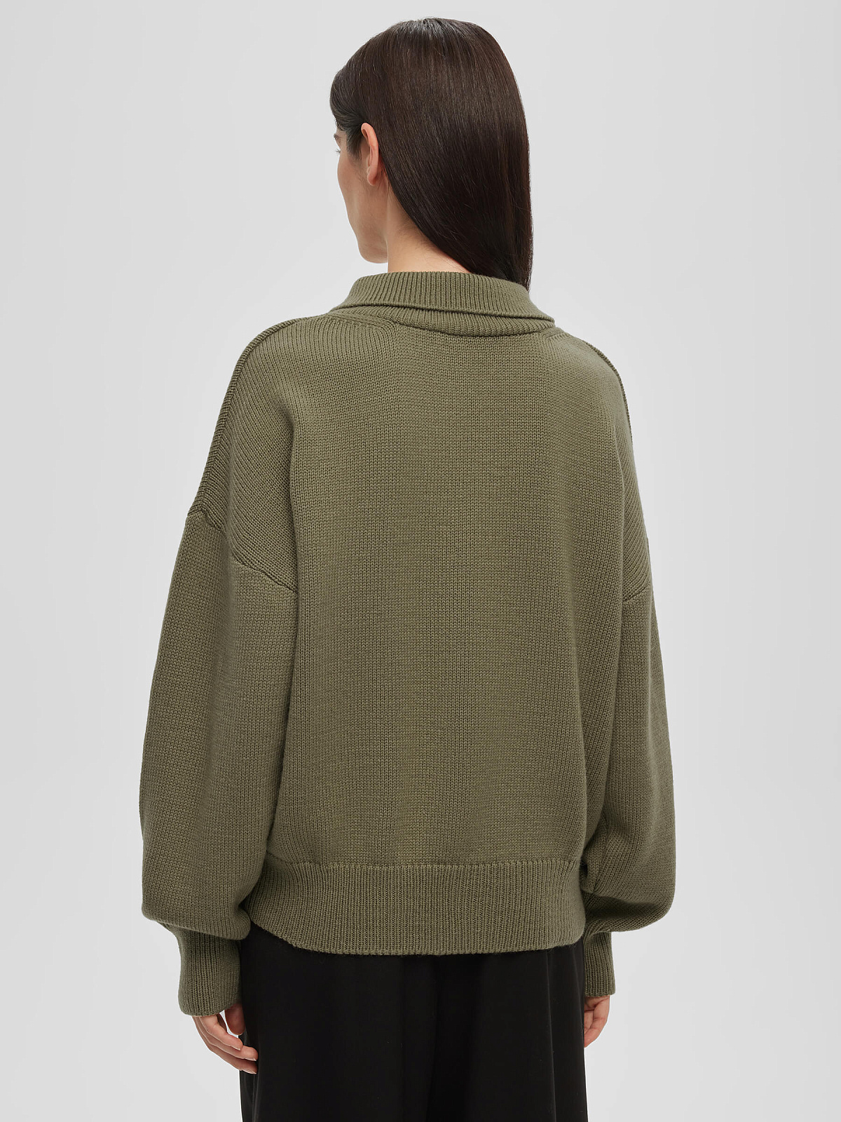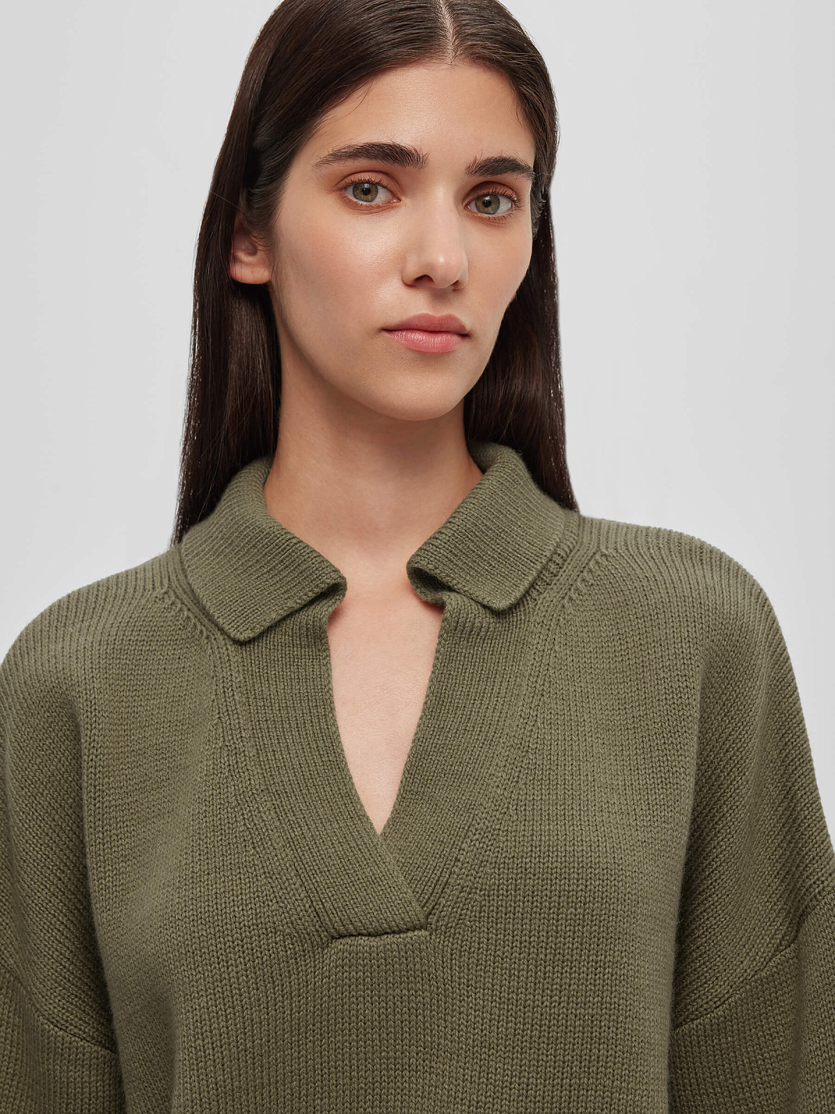 Джемпер-поло свободного кроя с отложным воротником, спущенной линией плеча и V-образным вырезом горловины.