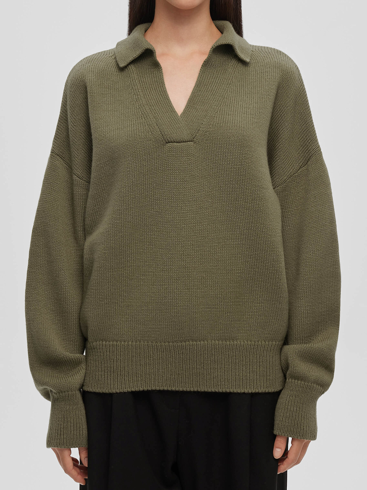 Джемпер-поло свободного кроя с отложным воротником, спущенной линией плеча и V-образным вырезом горловины.