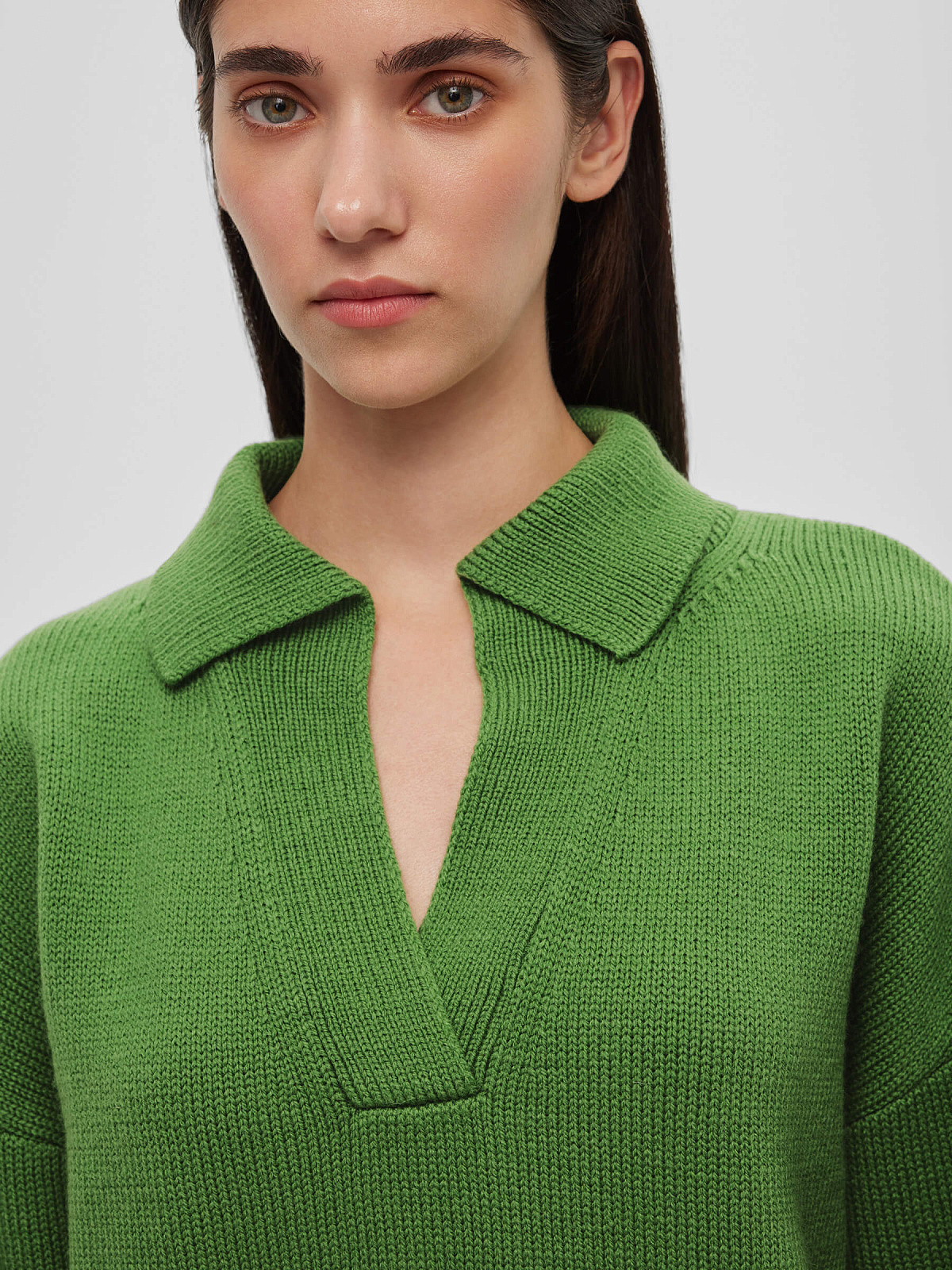 Джемпер-поло свободного кроя с отложным воротником, спущенной линией плеча и V-образным вырезом горловины.
