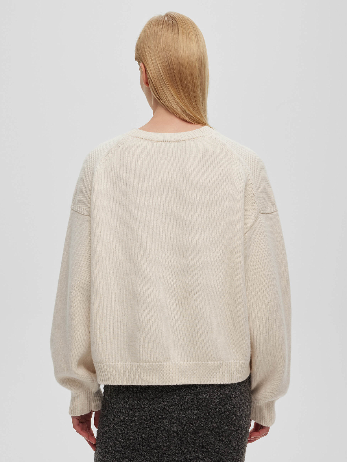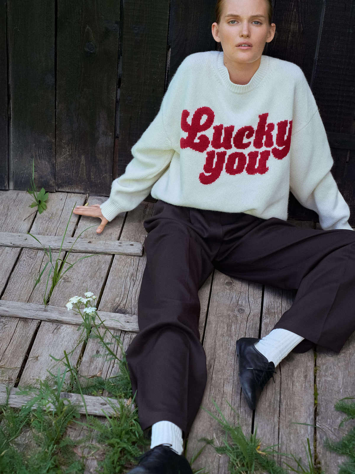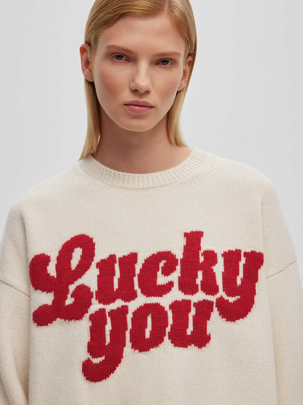 Джемпер с интарсией Lucky you из шерсти и хлопка со спущенной линией плеча.