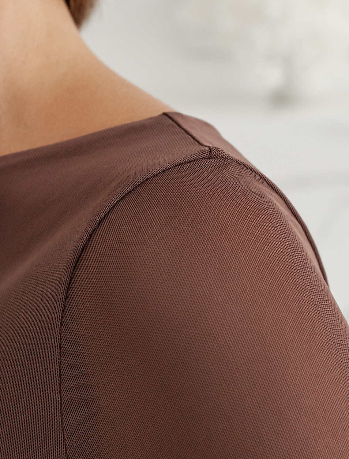 Джемпер с вырезом лодочкой и прозрачными рукавами создает женственный и элегантный образ. Тело джемпера кофейного цвета выполнено из плотного вискозного трикотажа, обеспечивающего комфорт, в то время как рукава из тонкой сетки создают стильный контраст. Глубокий вырез лодочка подчеркивает линию плеч и создает элегантный силуэт. Идеальный выбор для стильных образов! 95%ПЭ 5%ПУ, ПОДКЛАДКА: 95%Вис 5%ПУ