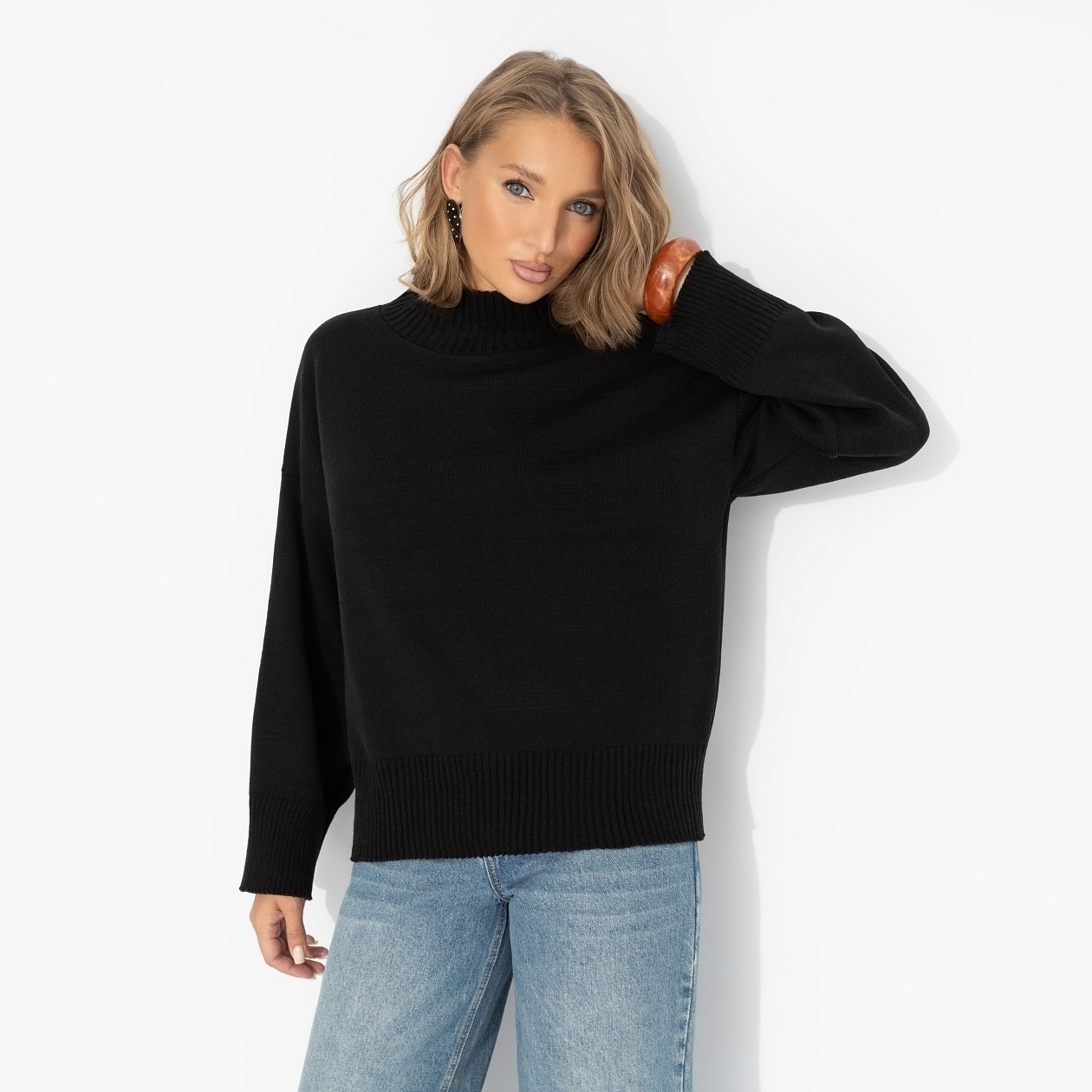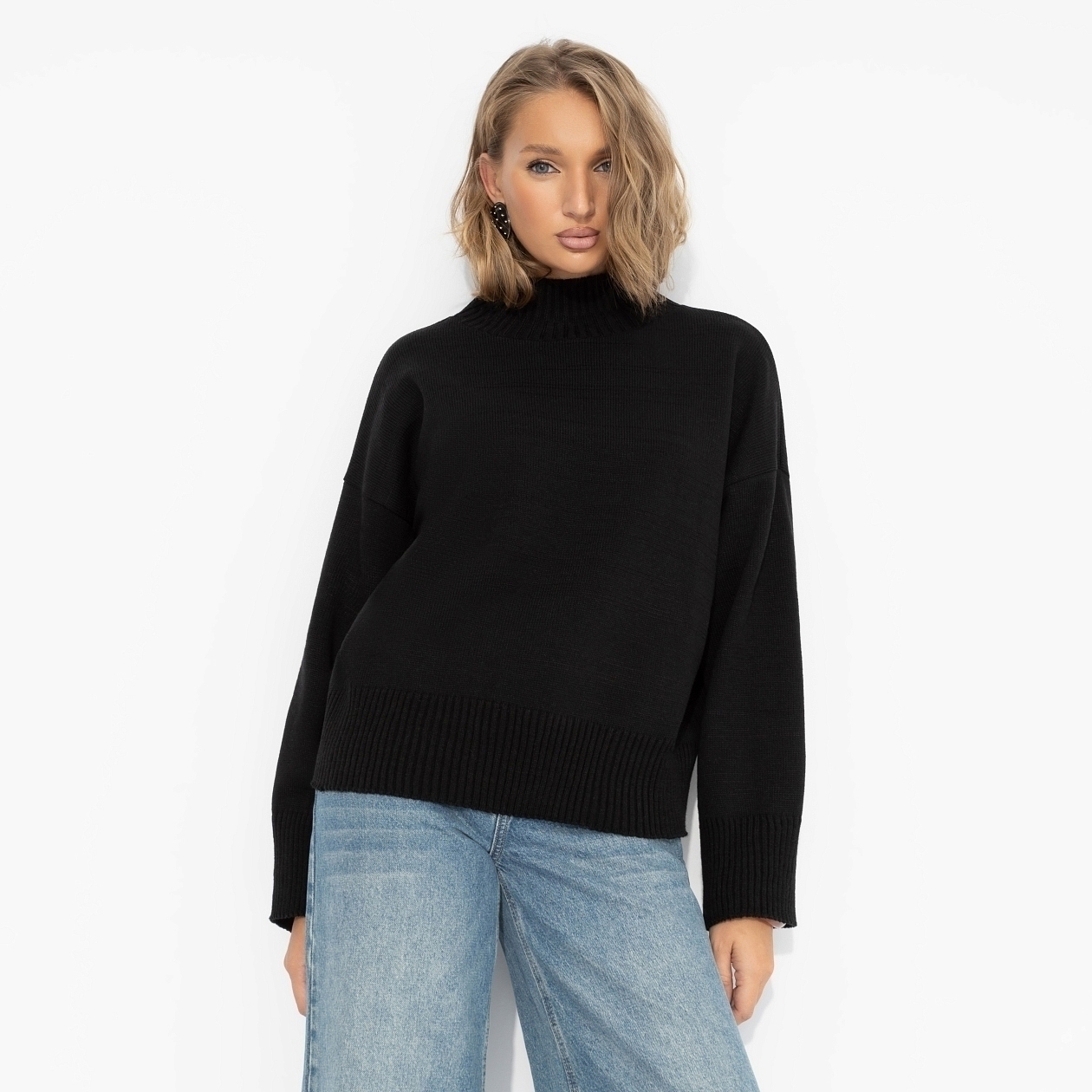 Базовый чёрный – когда ты создешь стиль без усилий. Уютная вязка и мягкая шерсть для максимального комфорта в образе на каждый день. Простая форма + мощная энергия – идеальное комбо. Джемпер с высоким воротником из вязаного трикотажа с добавлением шерстяной нити.