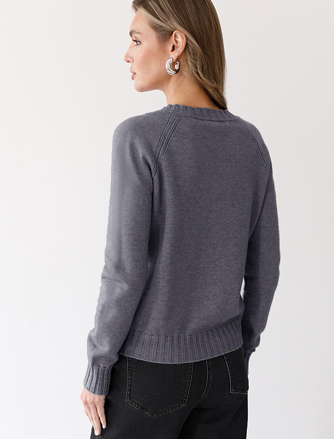 Невероятно женственный джемпер темно-серого цвета с V вырезом связан из высококачественной пряжи с кашемиром — идеальное сочетание мягкости и практичности. Пряжа с кашемиром придаёт ему бархатистую нежность и тонкую структуру, каждое прикосновение с которой, напоминает о тепле и уюте в прохладные дни. Благодаря нежной текстуре материала этот вариант отлично подходит даже для чувствительной кожи, не вызывая раздражения и дискомфорта в течение дня. Сдержанный, элегантный силуэт джемпера подчёркивает вкуc обладательницы, а филигранная отделка ворота — внимание к деталям. Универсальный оттенок и изящная мягкость делают его идеальным выбором в любой ситуации. Широкие манжеты и нижний край добавляют аккуратности, а продуманная посадка делает повседневный джемпер удобным для многослойных образов — от офисного комплекта, например, в сочетании с блузкой, до расслабленного уикенда. Свободный крой джемпера идеально подходит для женщин, которые ценят удобство и стиль одновременно, а так же идеально подходит на большие размеры. Благодаря качественной пряже свитер сохраняет форму и внешний вид даже после многократных носок. Практичный фасон идеально подходит для работы в офисе или встреч с друзьями. Благодаря классическому крою джемпер гармонично сочетается практически с любыми элементами гардероба, помогая всегда выглядеть актуально. Сочетается в костюме с брюками D38.013, D38.012 и юбкой D36.016
