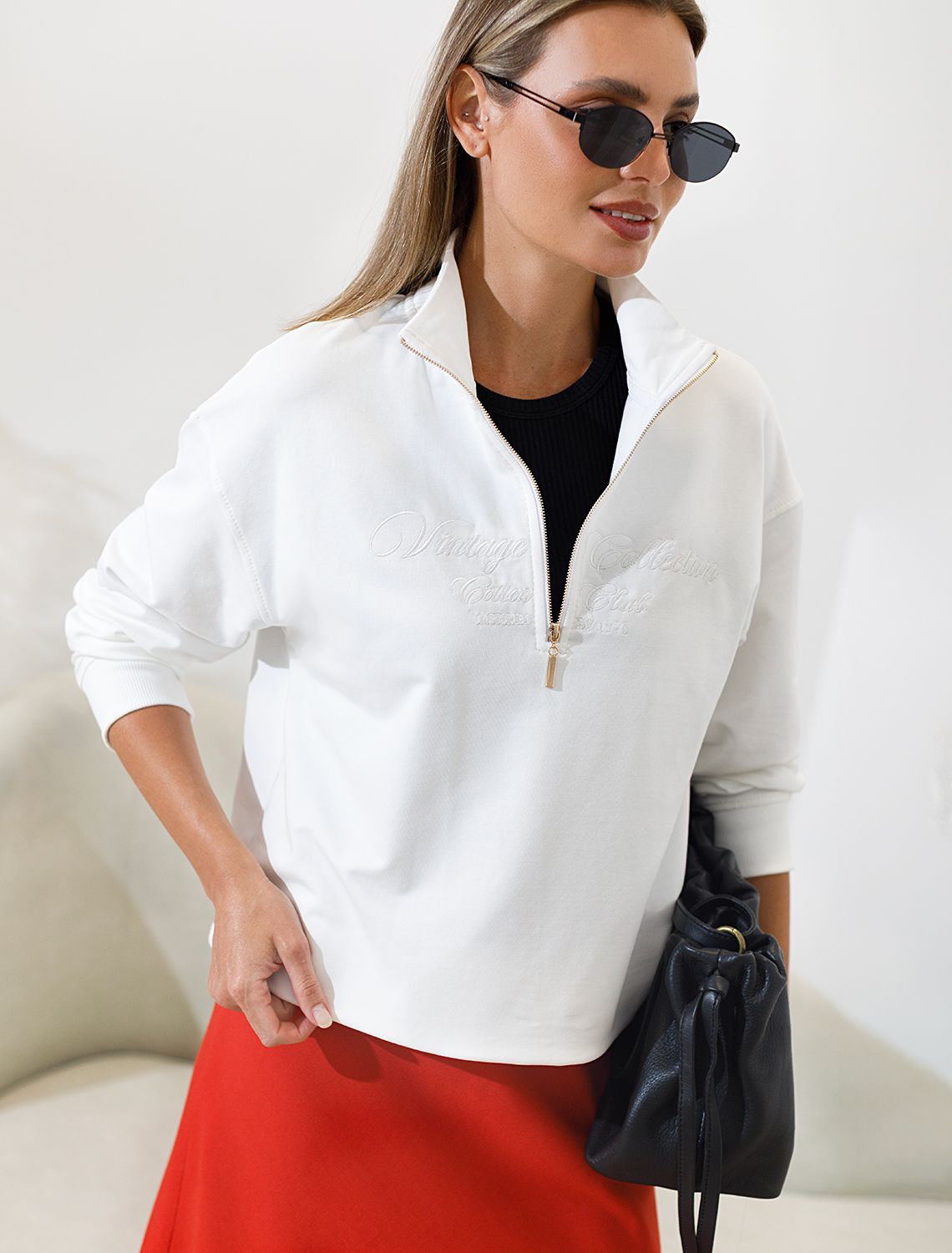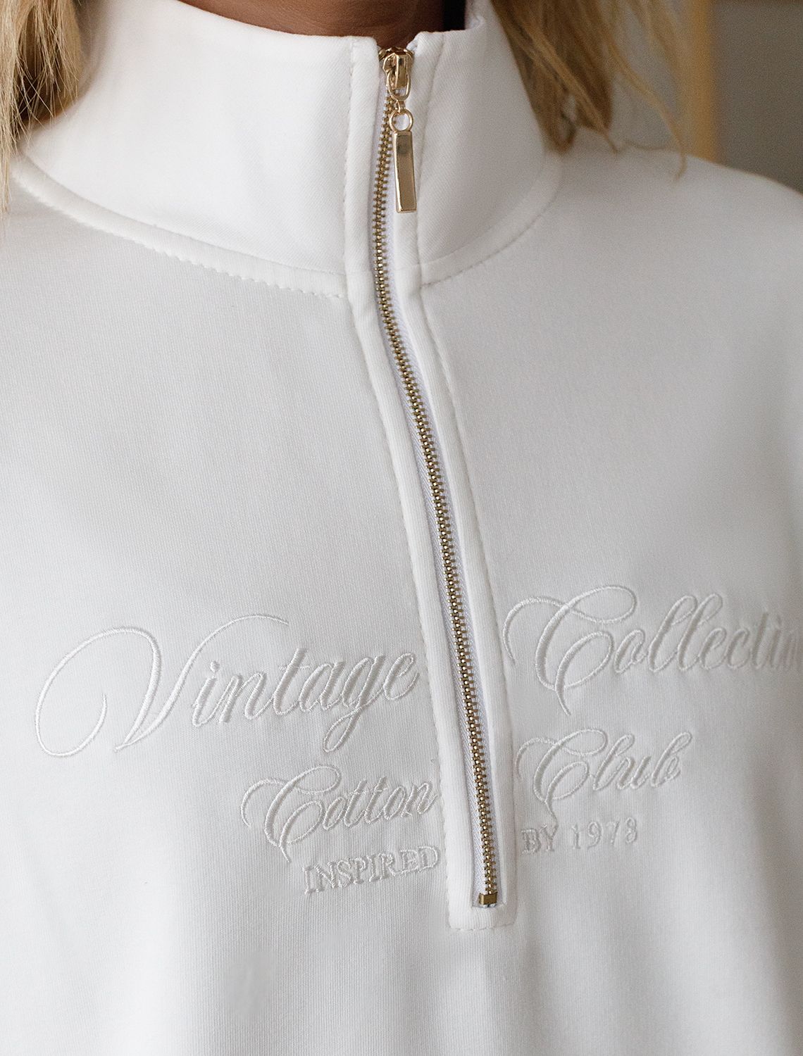 Уютный и комфортный вариант для прохладной погоды – стильный джемпер белого цвета с воротом на молнии. Изготовлен из премиального футера двухнитки с добавлением эластана. Материал сохраняет форму при длительном ношении и после многократных стирок, его мягкая текстура дарит ощущение уюта и тепла. Минималистичная вышивка в тон изделия в виде надписи. перевод надписи: Vinlage collection cotton club - Винтажная коллекция Хлопковый клуб. Свободный крой джемпера позволяет не ограничивать движения, что особенно важно для активного образа жизни. Подойдет на любую женскую фигуру, представлена широкая размерная линейка, большие размеры, легко комбинируется с другими вещами, создавая модные образы в стиле спорт-шик. Этот повседневный джемпер сочетает в себе удобство и актуальность, будет универсальным выбором для отдыха или прогулок.