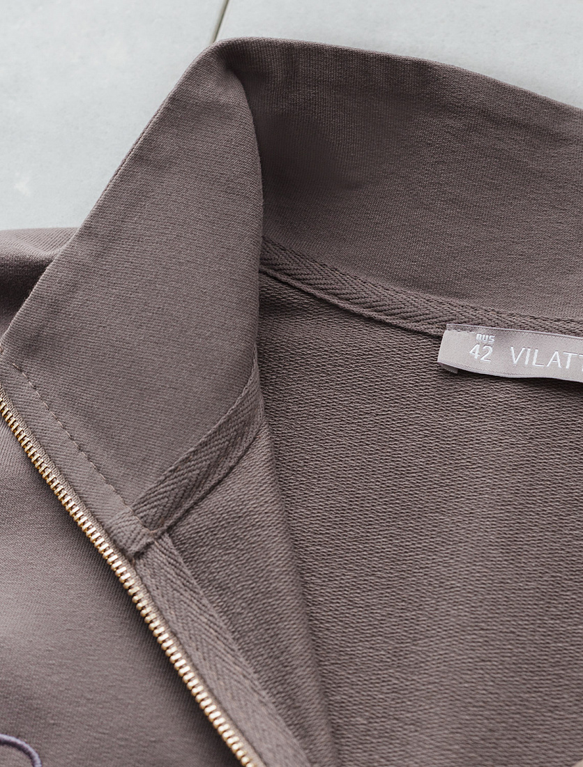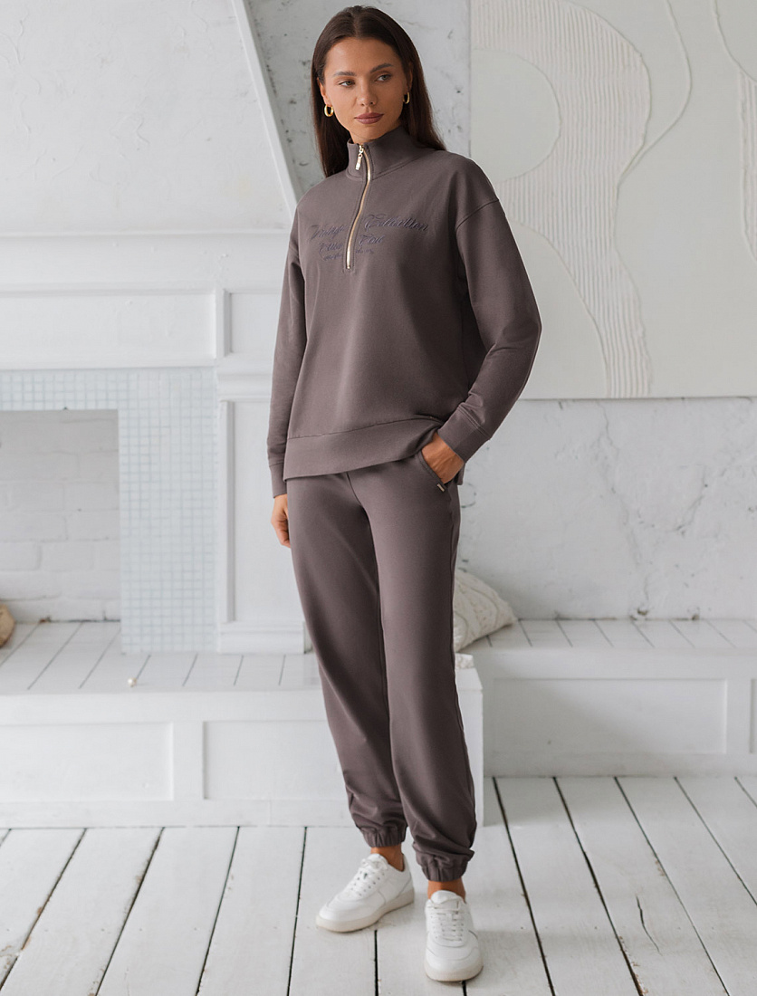 Уютный и комфортный вариант для прохладной погоды – стильный джемпер кофейного цвета с воротом на молнии. Изготовлен из премиального футера двухниткии с добавлением эластана. Материал сохраняет форму при длительном ношении и после многократных стирок, его мягкая текстура дарит ощущение уюта и тепла. Минималистичная вышивка в тон изделия в виде надписи. еревод надписи: Vinlage collection cotton club - Винтажная коллекция Хлопковый клуб. Свободный крой джемпера позволяет не ограничивать движения, что особенно важно для активного образа жизни. Подойдет на любую женскую фигуру, представлена широкая размерная линейка, большие размеры, легко комбинируется с другими вещами, создавая модные образы в стиле спорт-шик. Этот повседневный джемпер сочетает в себе удобство и актуальность, будет универсальным выбором для отдыха или прогулок. Сочетается в костюме с шортами D48.010, брюками D44.152, D44.137, D44.136 95%Хлопок 5%ПУ