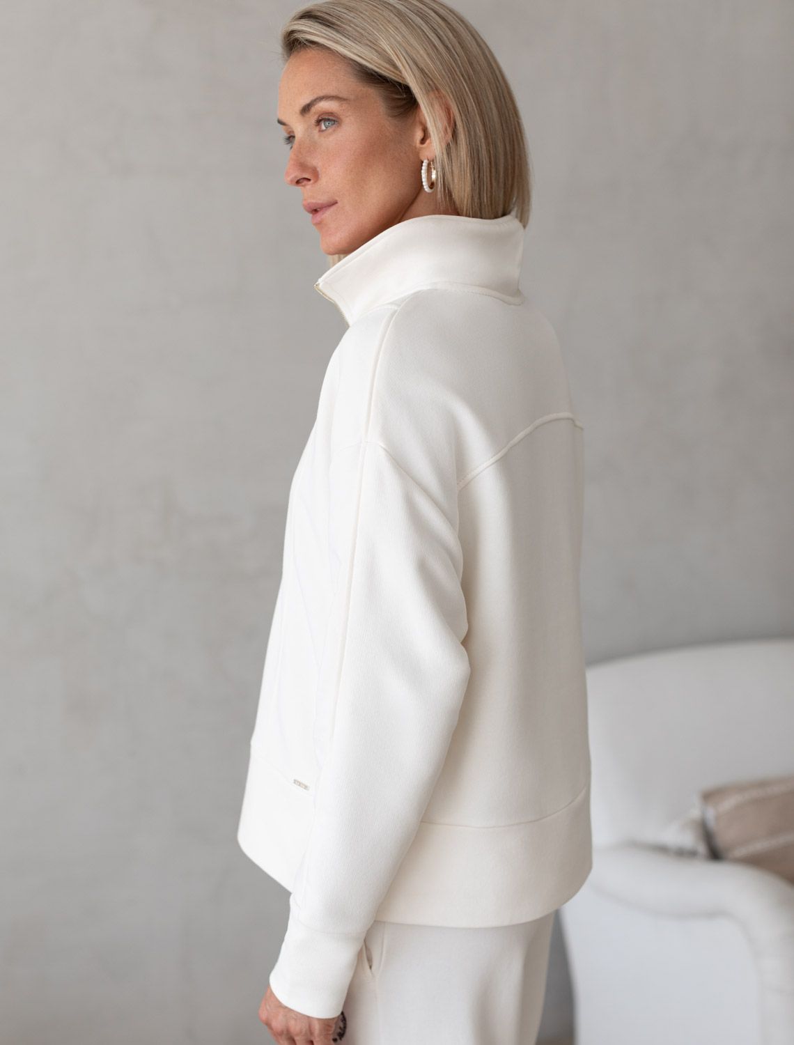 Уютный и комфортный вариант для прохладной погоды – стильный джемпер белого цвета с воротом на молнии. Изготовлен из премиального футера трехнитки с добавлением эластана. Материал сохраняет форму при длительном ношении и после многократных стирок, его мягкая текстура дарит ощущение уюта и тепла.