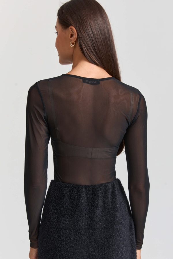 Базовый лонгслив из трикотажного полотна «сетка». Модель прилегающего силуэта. Рукав длинный.
