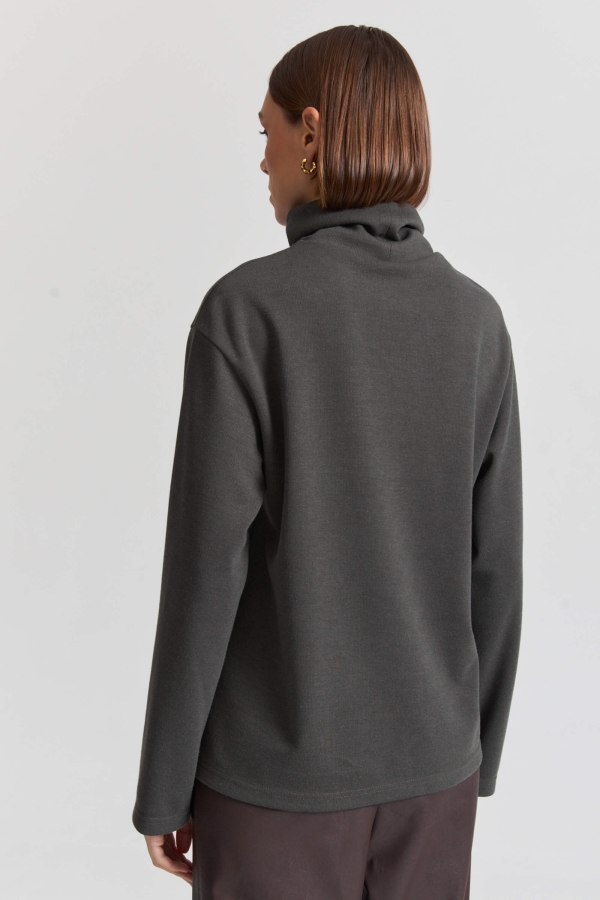 Комфортный джемпер из трикотажного полотна в мелкий рубчик. Модель свободная со слегка расширенным прямым рукавом и высокой горловиной.