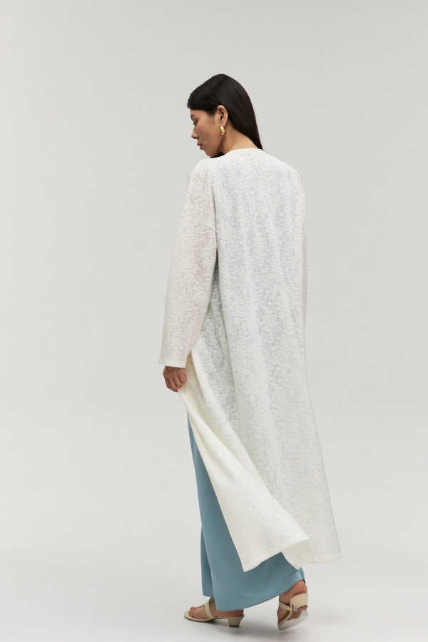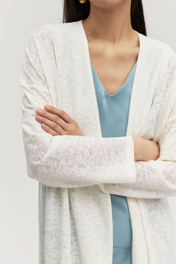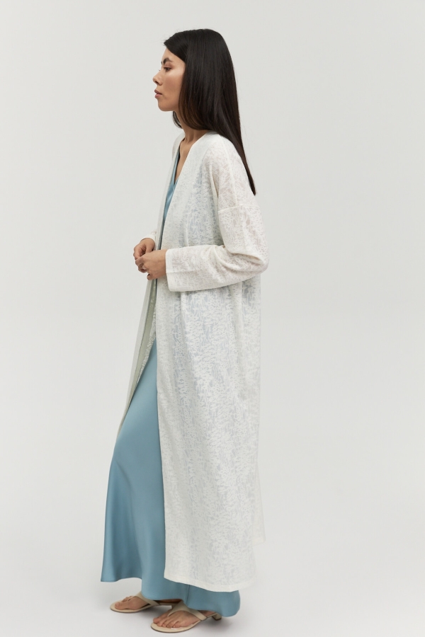 Кардиган из вискозного трикотажа с тропическим, фактурным принтом. Модель свободного силуэта. Рукав спущенный, свободный.