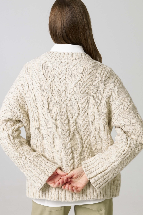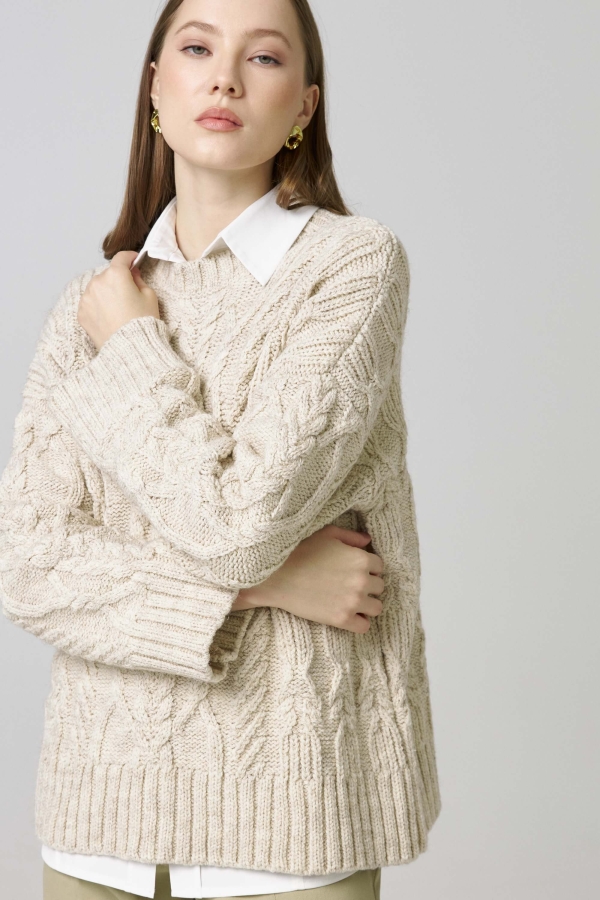 Уютный джемпер из смесовой пряжи с шерстью. Модель свободного силуэта со спущенной линией плеча. Вязка косами. Круглый вырез. Резинка на рукавах и по низу изделия.