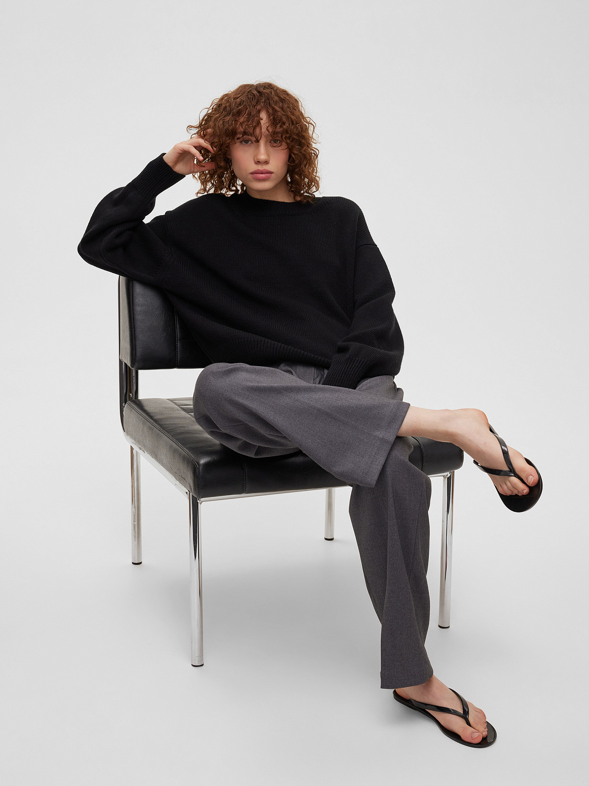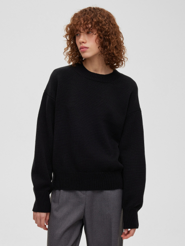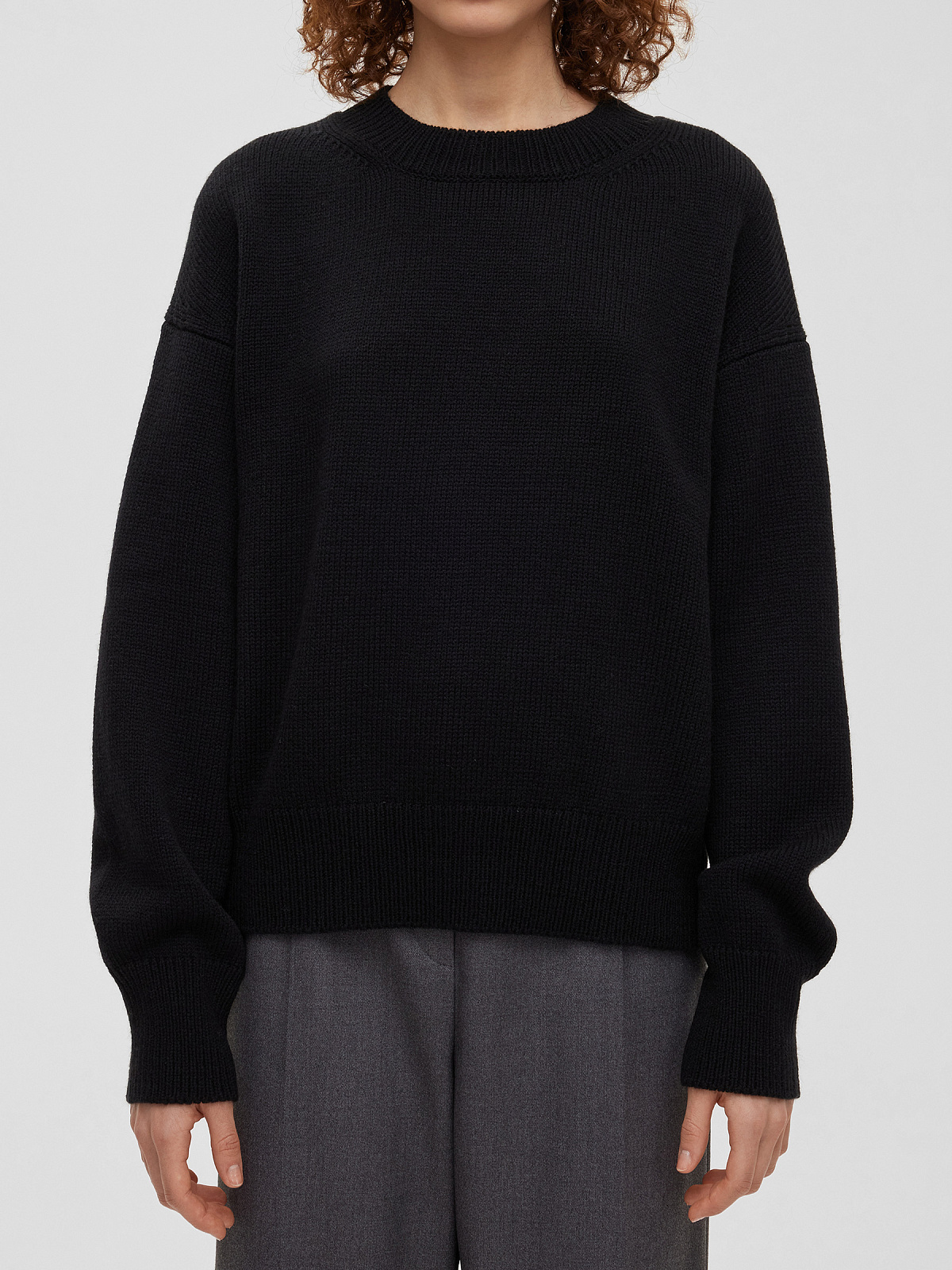 Джемпер свободного кроя с круглым вырезом горловины и спущенной линией плеча.