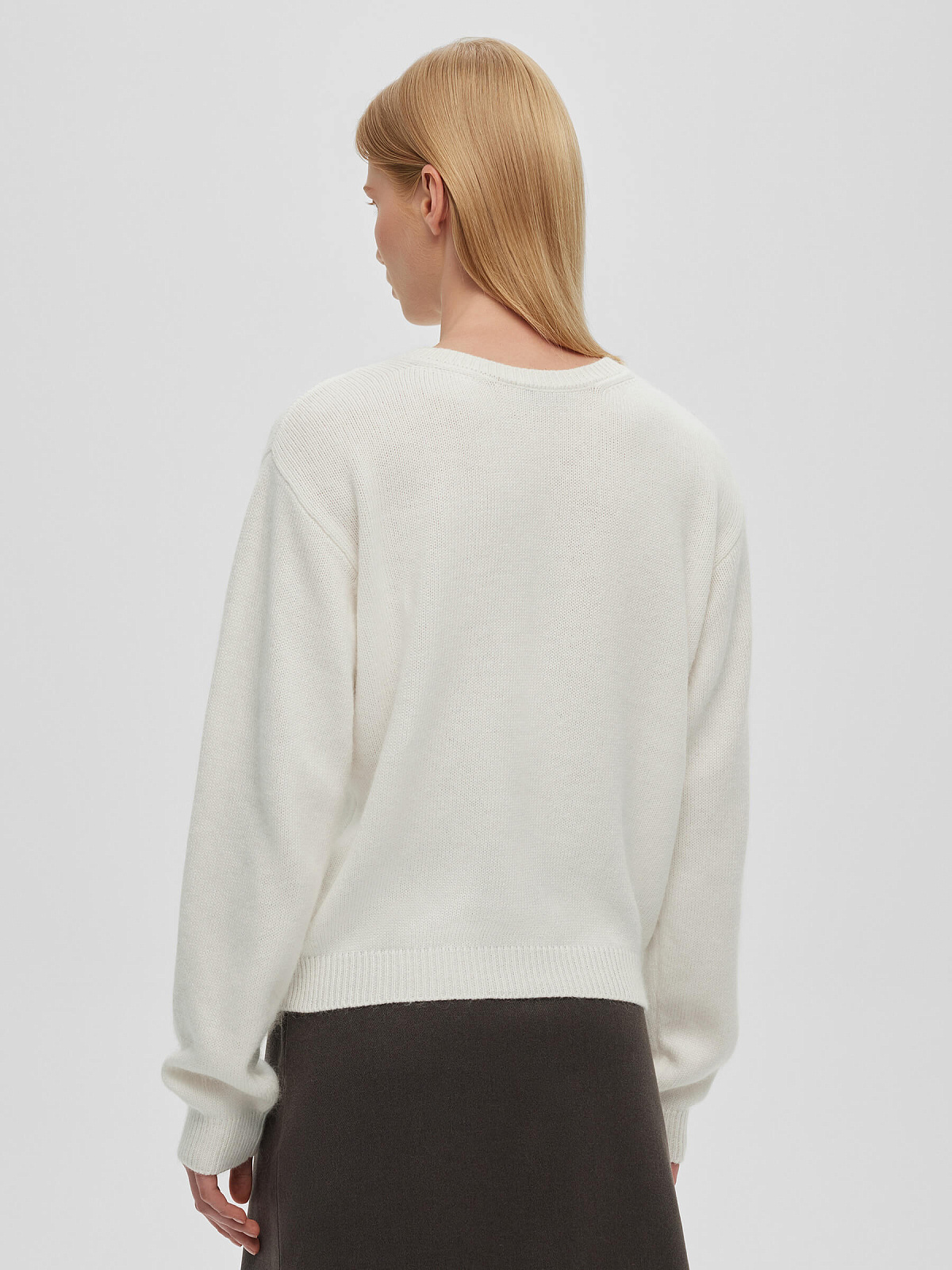 Джемпер свободного кроя с ангорой, со спущенной линией плеча по спинке. Изготовлен из смесовой пряжи улучшенных свойств. Комбинация пуха ангорского кролика и тонкой шерсти в составе создают текстуру с характерным ворсом.