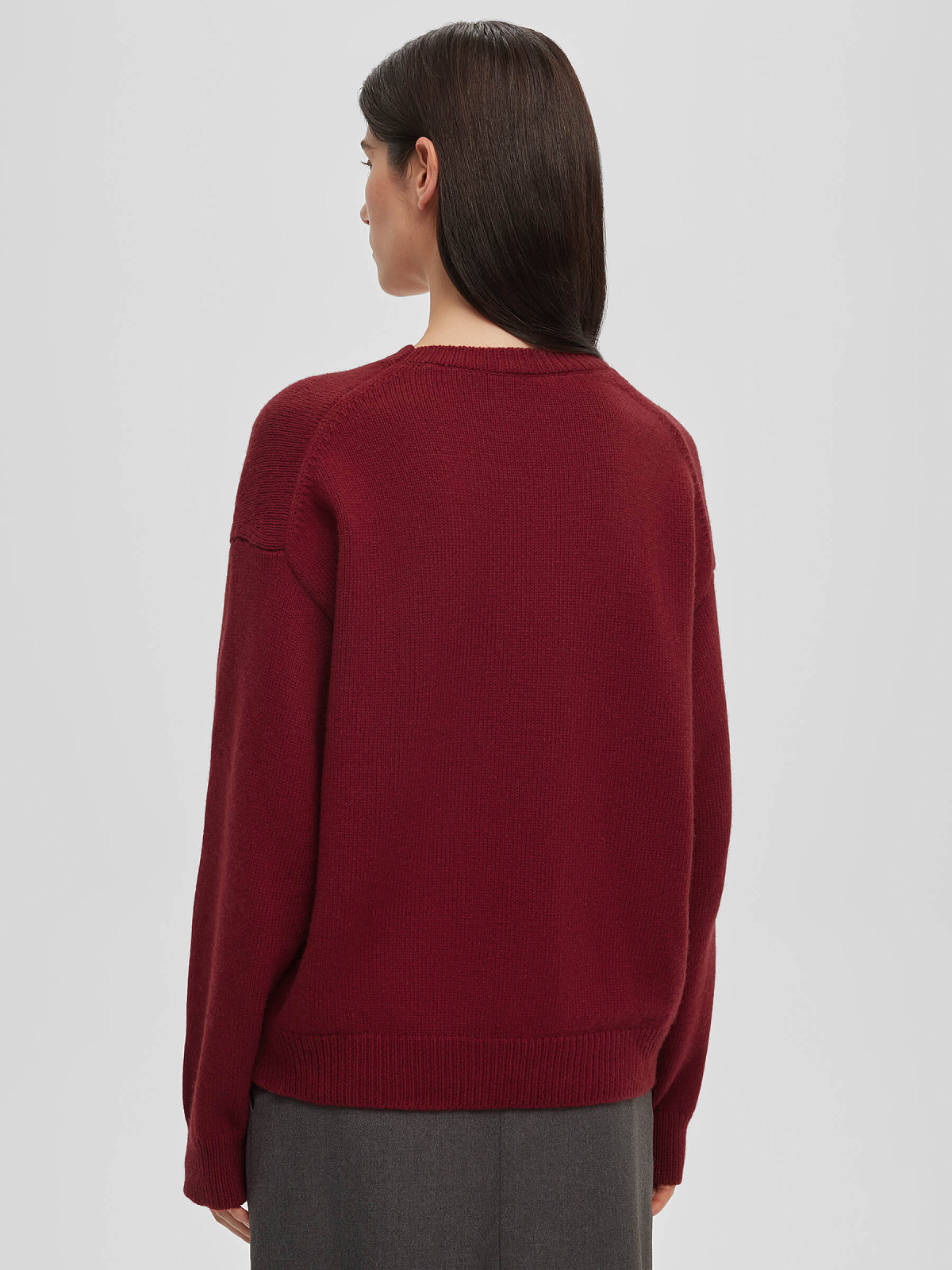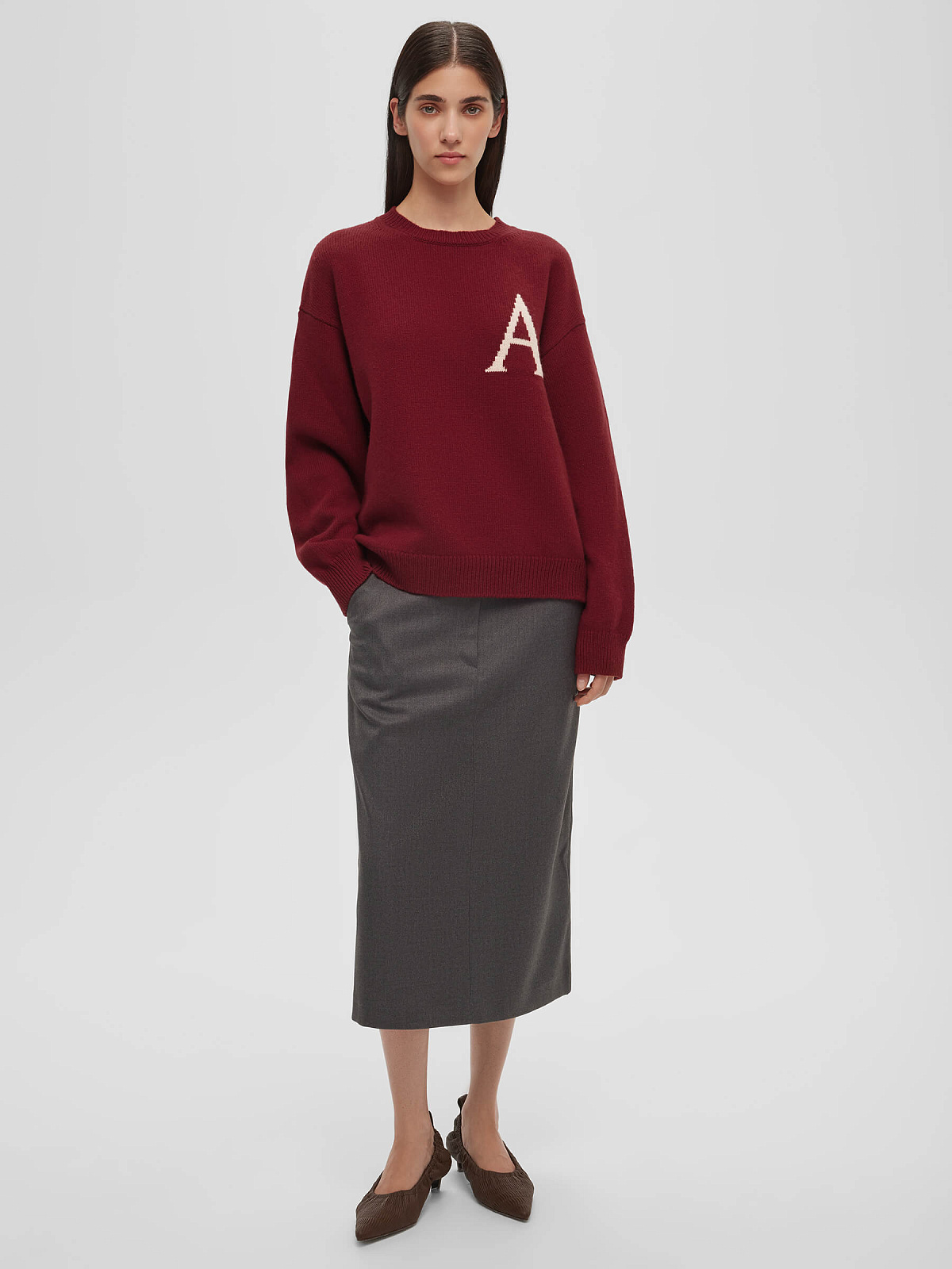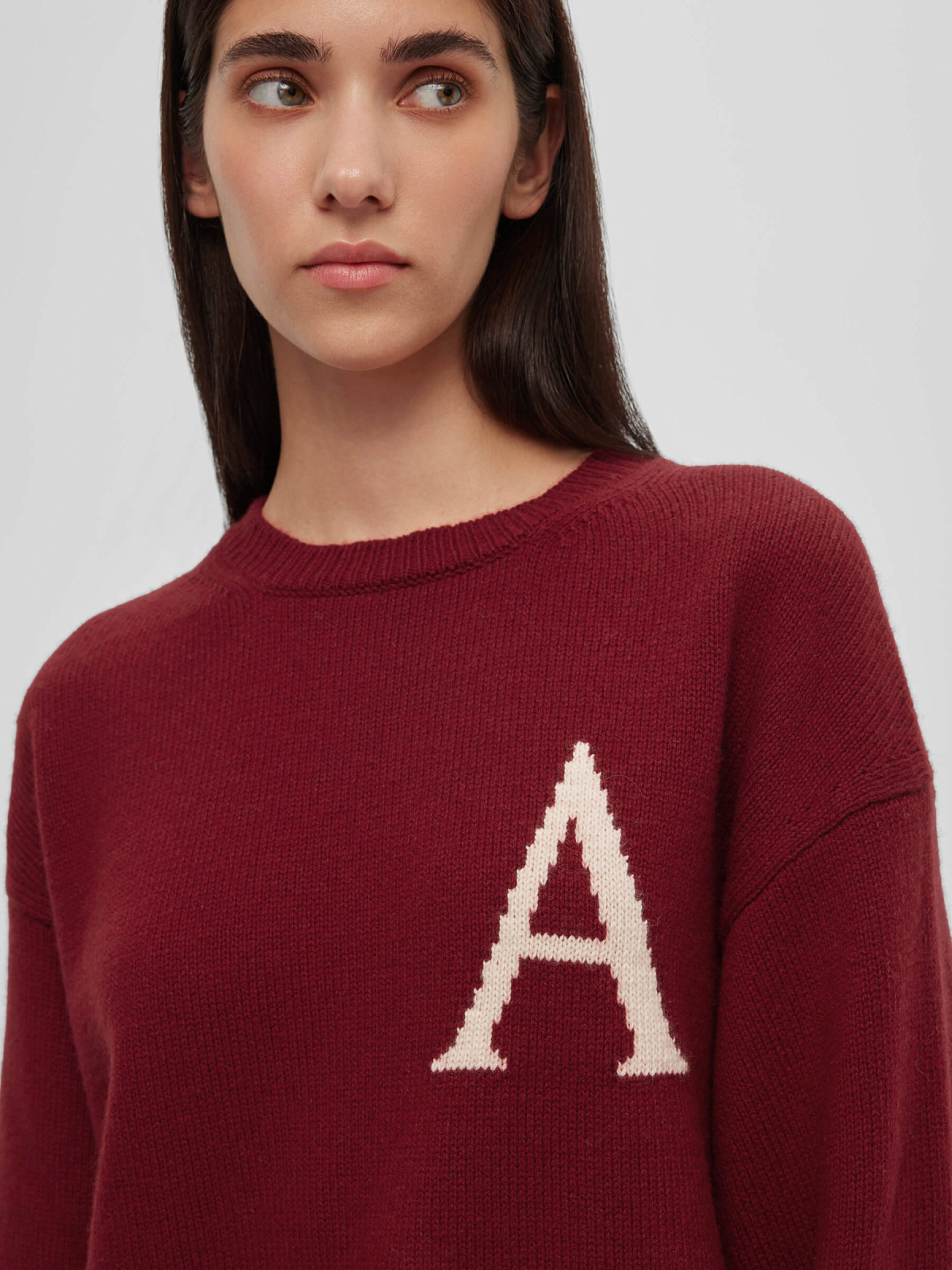 Джемпер свободного кроя с круглым вырезом горловины, спущенной линией плеча. Резинка на рукавах и по низу изделия. Буква «А» вывязана в специальной технике – интарсия. Изготовлен из  натуральной смесовой пряжи с шерстью и хлопком в составе.