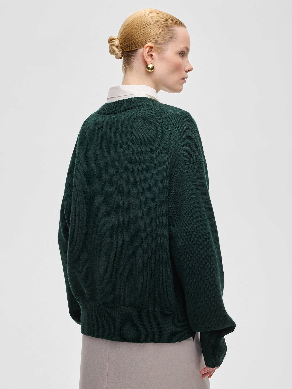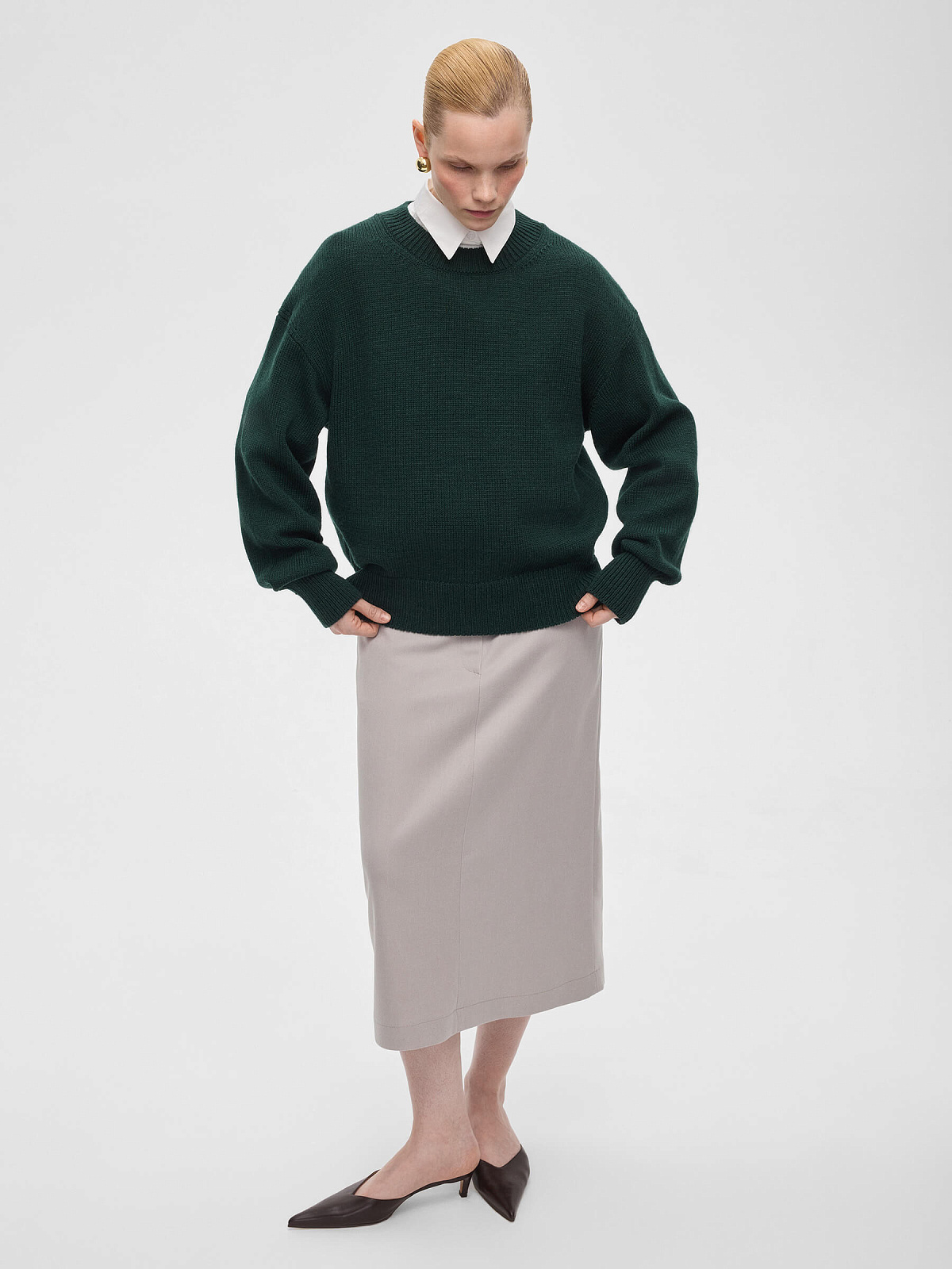 Джемпер свободного кроя с круглым вырезом горловины и спущенной линией плеча.