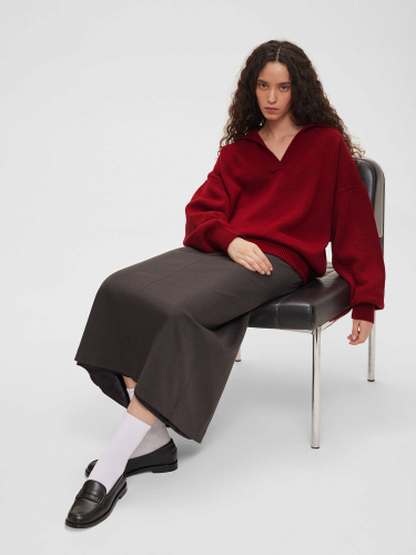 Джемпер свободного кроя с круглым вырезом горловины и спущенной линией плеча.