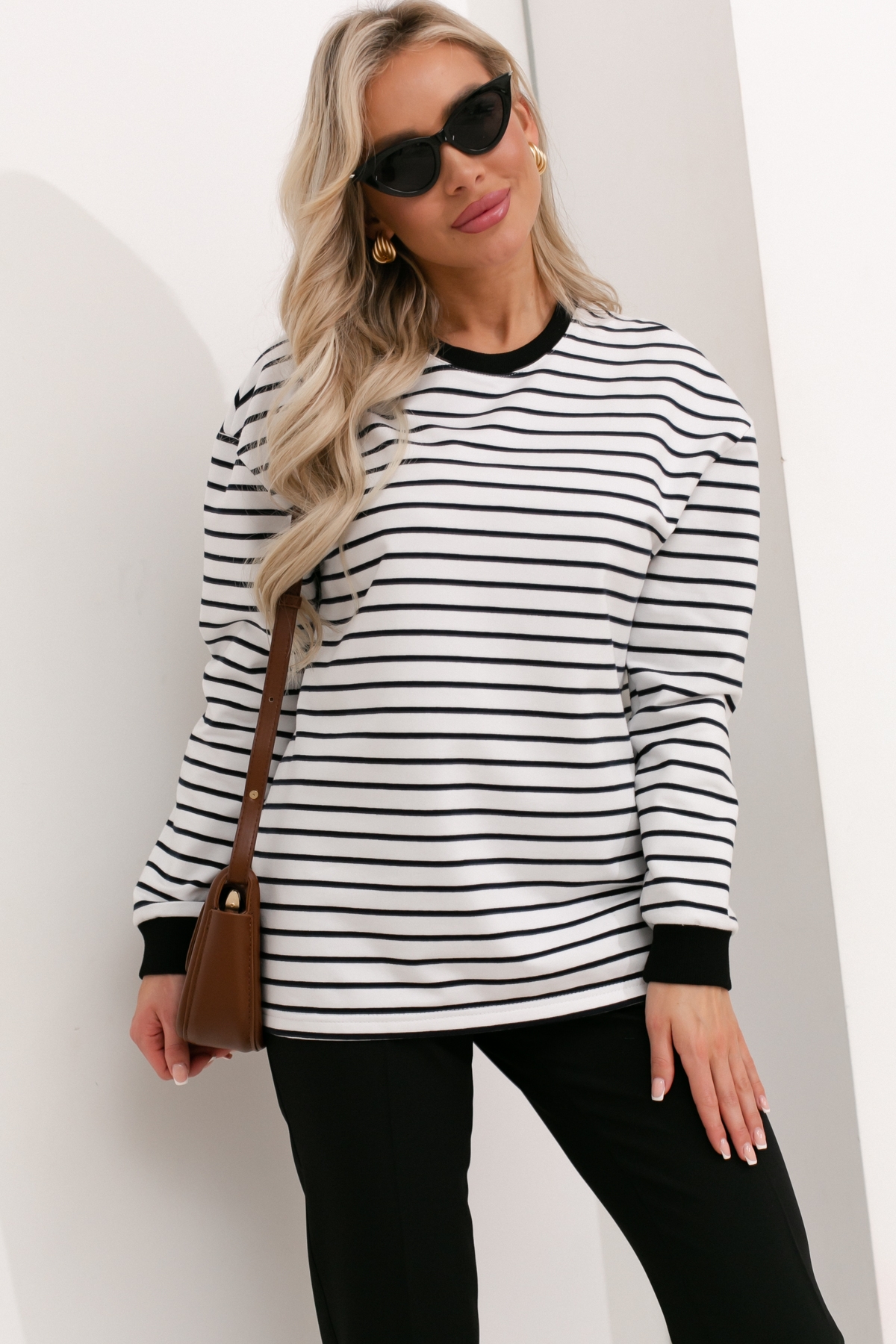 Стильный свитшот из трикотажного полотна прямого силуэта. Округлая горловина. Плечо спущенное, рукав оканчивается притачной манжетой. Низ ровный, без разрезов.