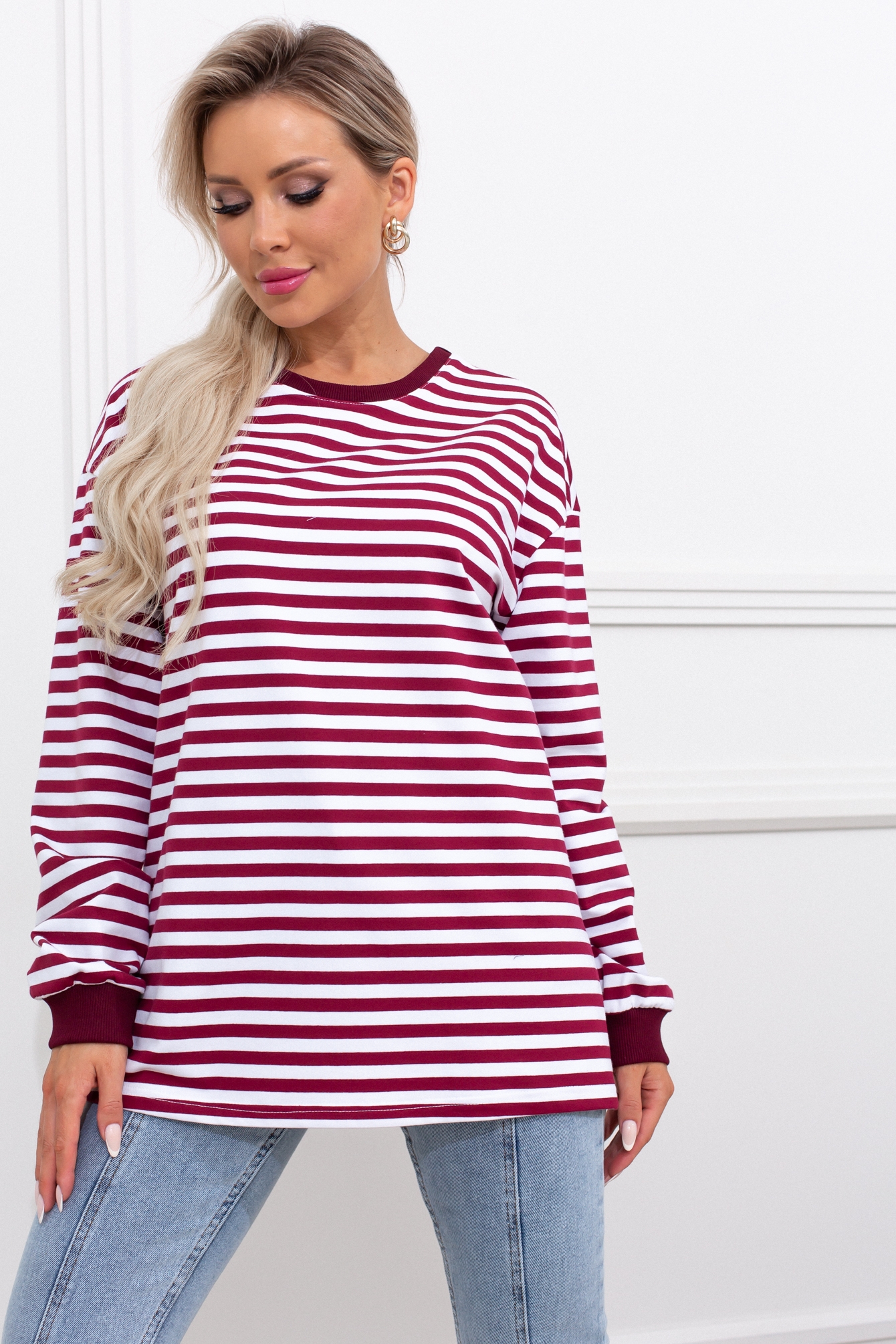 Стильный свитшот из трикотажного полотна прямого силуэта. Округлая горловина. Плечо спущенное, рукав оканчивается притачной манжетой. Низ ровный, без разрезов.
