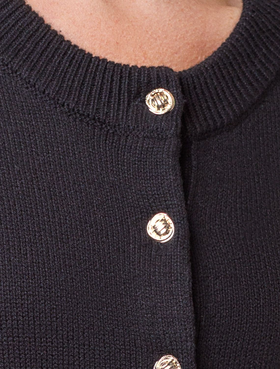 Джемпер тонкой вязки выполнен из хлопка с добавлением кашемира. Модель с круглым вырезом дополнена золотистыми пуговицами. Мягкая и очень приятная пряжа совершенно не колется, сохраняет тепло при этом не перегревая, гарантируя безупречный комфорт.