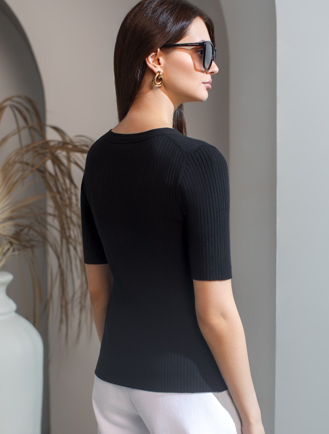 Джемпер тонкой вязки из вискозы с нейлоном. Для производства изделия использована пряжа сердечникового прядения — когда нейлоновая нить (основа) обвивается вискозой. Вискоза обеспечивает приятную тактильность и гигроскопичность, а нейлон предотвращает растяжение и повышает устойчивость к пилингуемости. Модель с V- вырезом прилегающего силуэта дополнена золотистыми пуговицами. Изделие дополнено фирменным металлическим логотипом бренда.