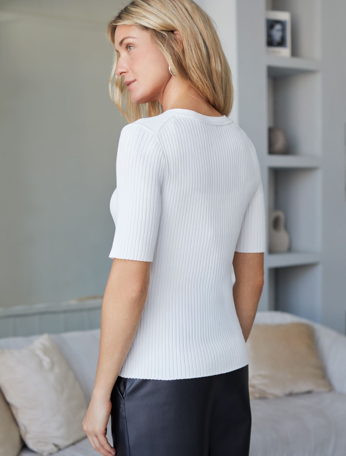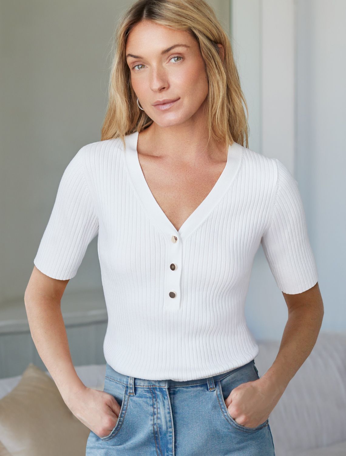 Джемпер тонкой вязки из вискозы с нейлоном. Для производства изделия использована пряжа сердечникового прядения — когда нейлоновая нить (основа) обвивается вискозой. Вискоза обеспечивает приятную тактильность и гигроскопичность, а нейлон предотвращает растяжение и повышает устойчивость к пилингуемости. Модель с V- вырезом прилегающего силуэта дополнена золотистыми пуговицами. Изделие дополнено фирменным металлическим логотипом бренда.